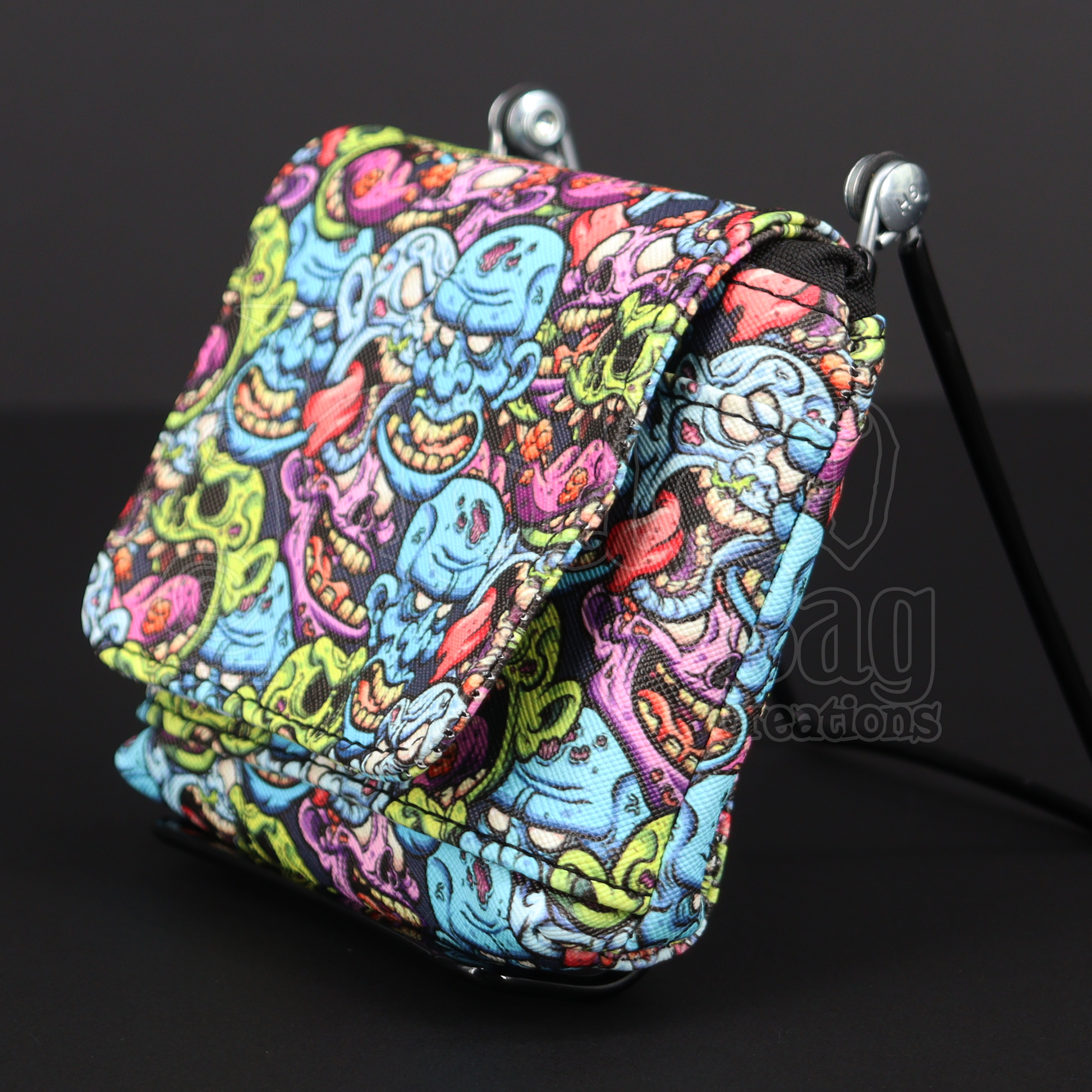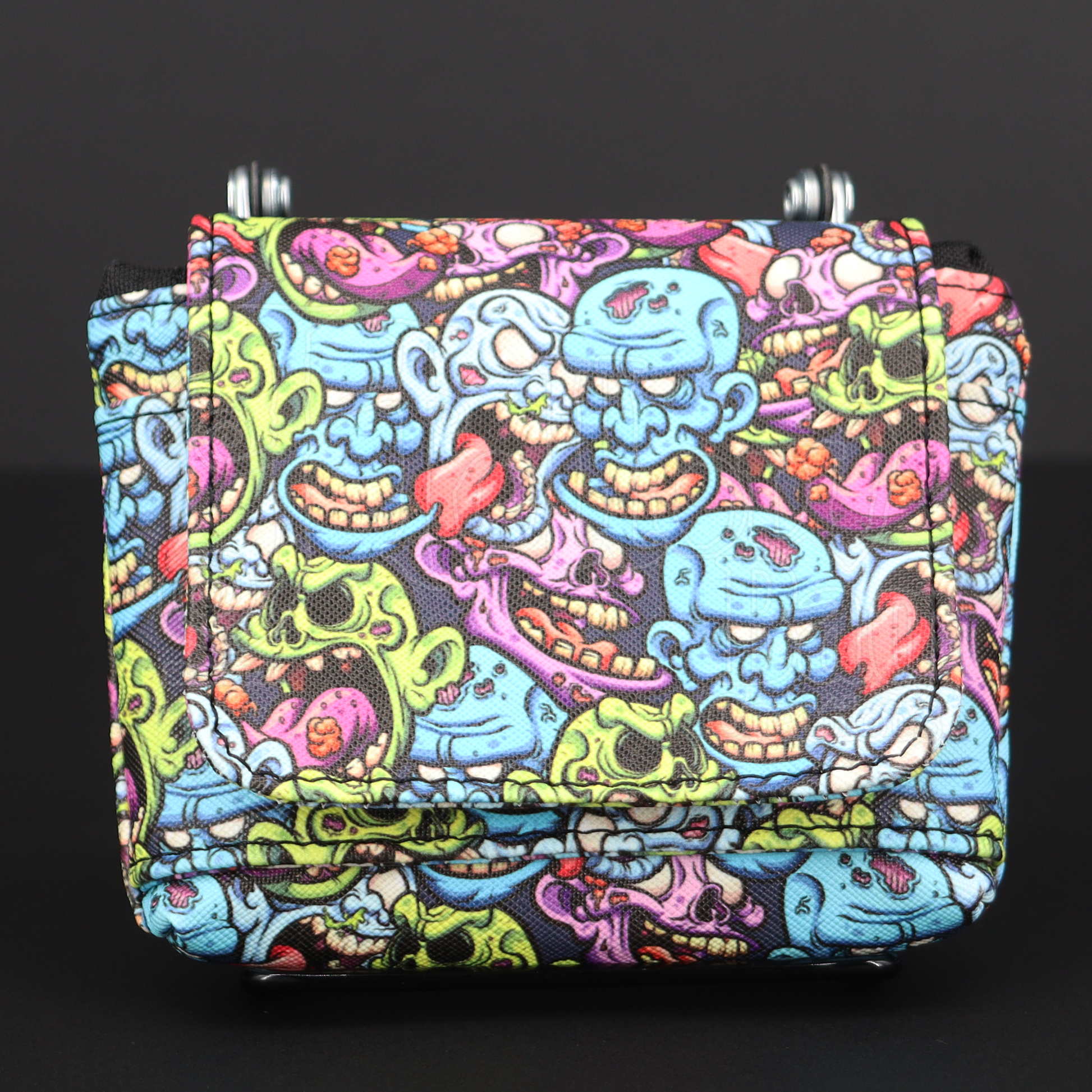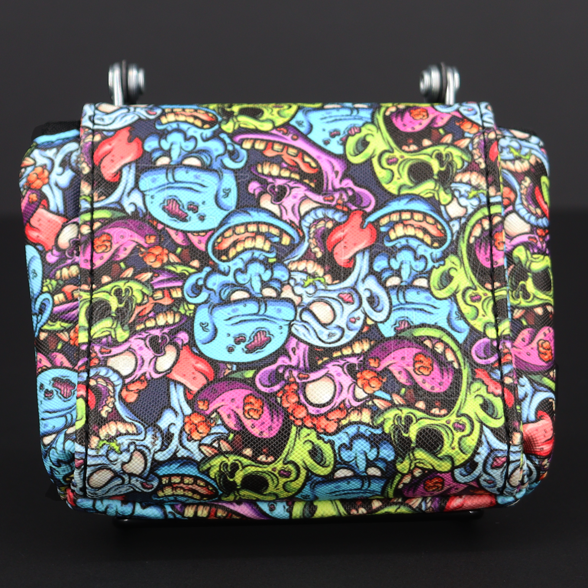 The materials used are custom vinyl for the entire outside, and waterproof canvas on the inside.