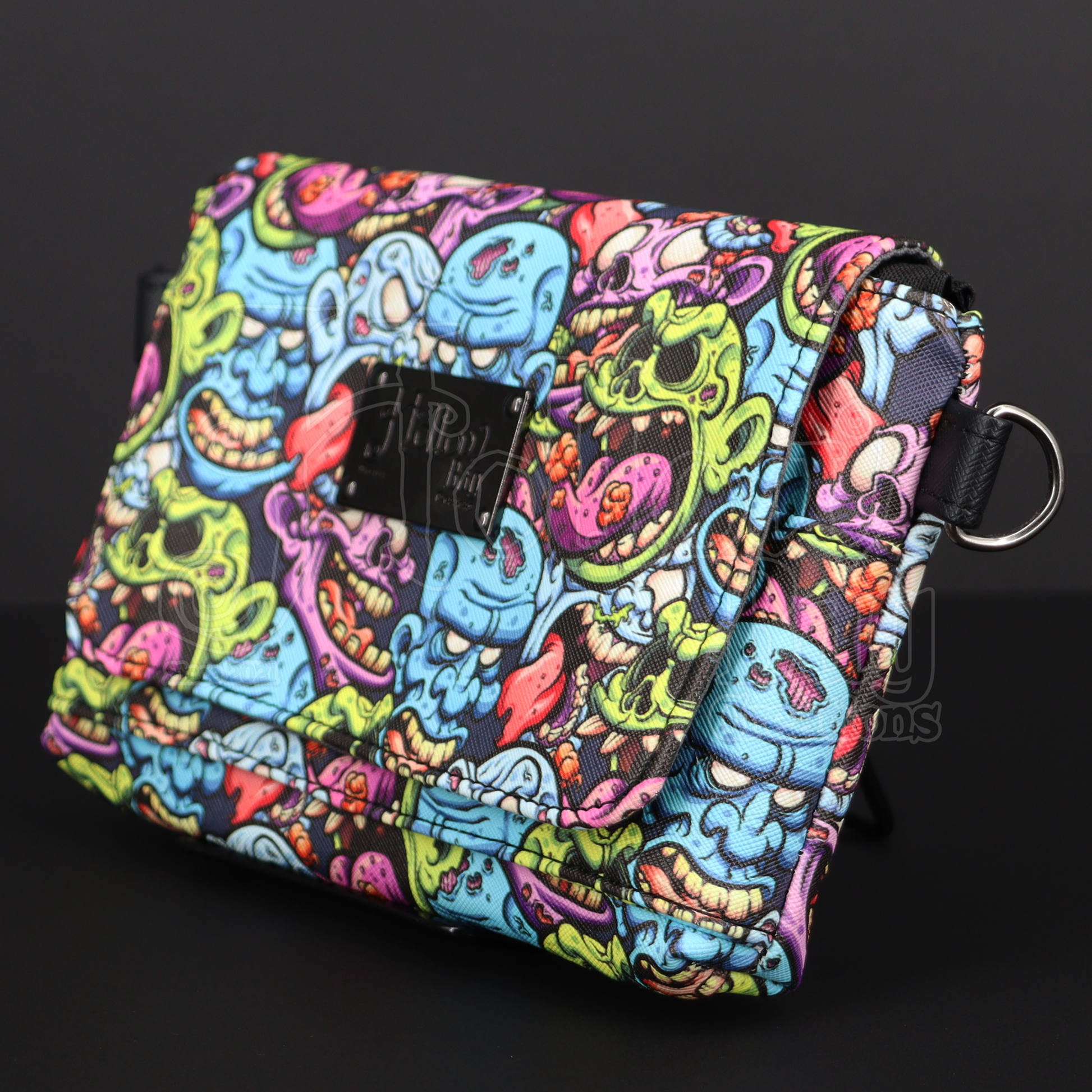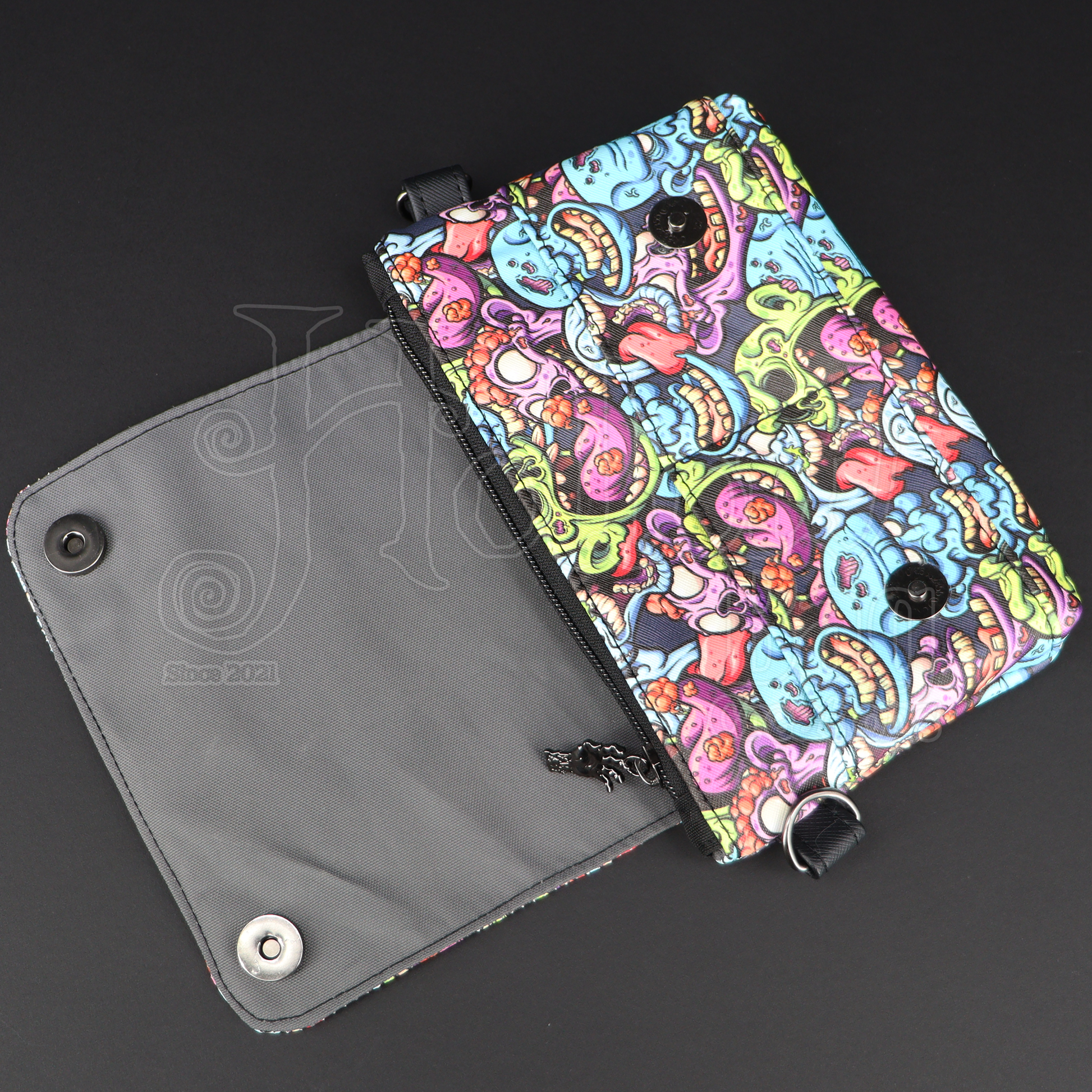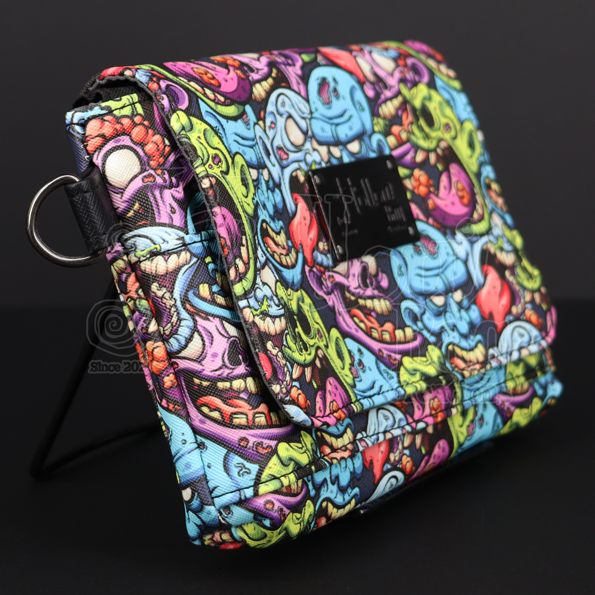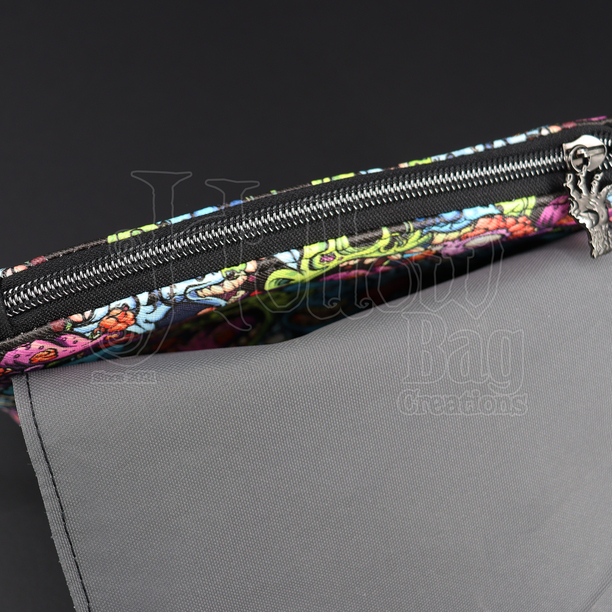 The materials used are custom vinyl for the entire outside and strap, and waterproof canvas on the inside.