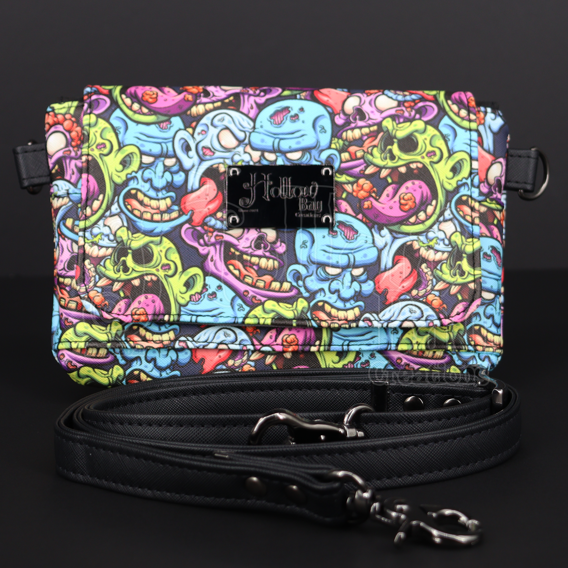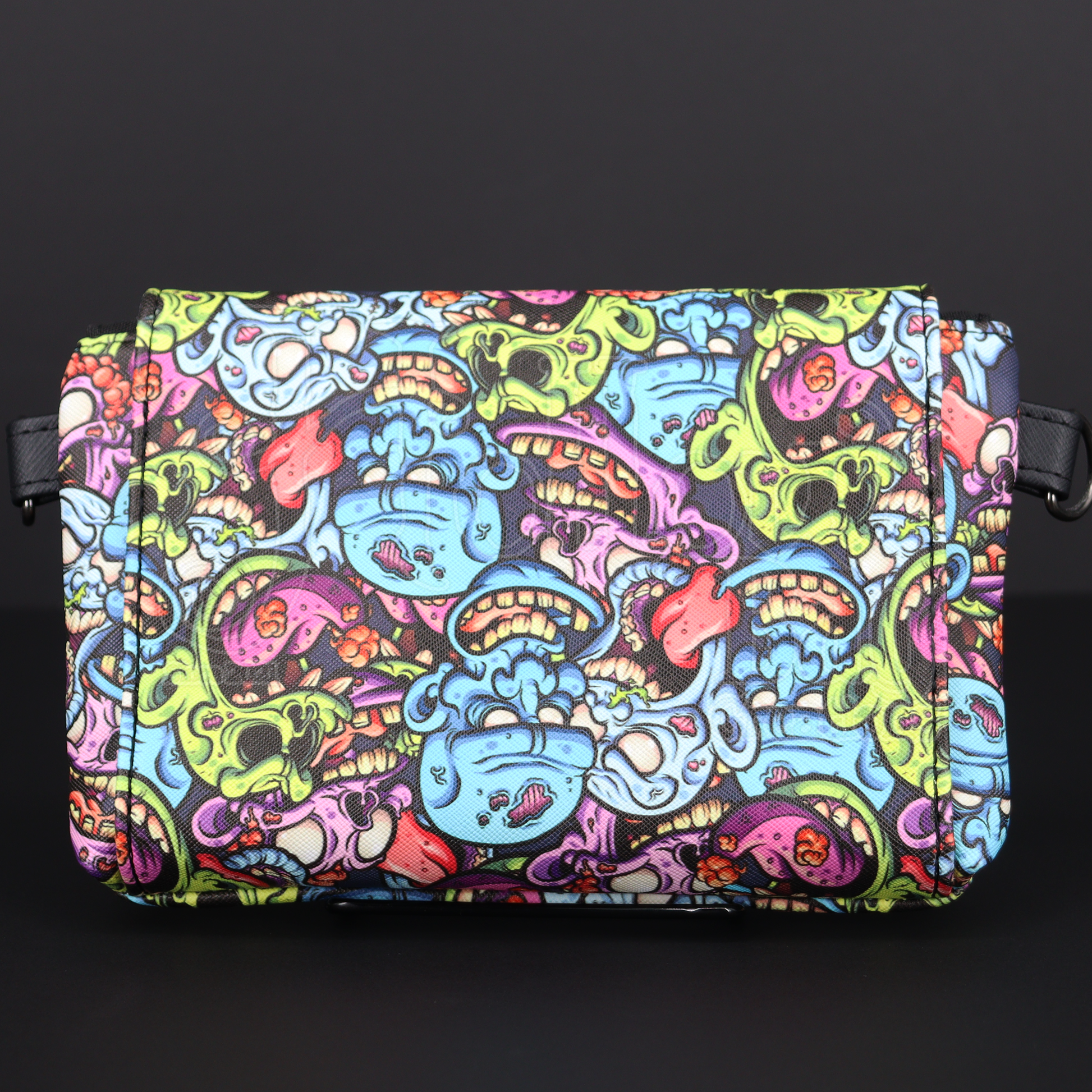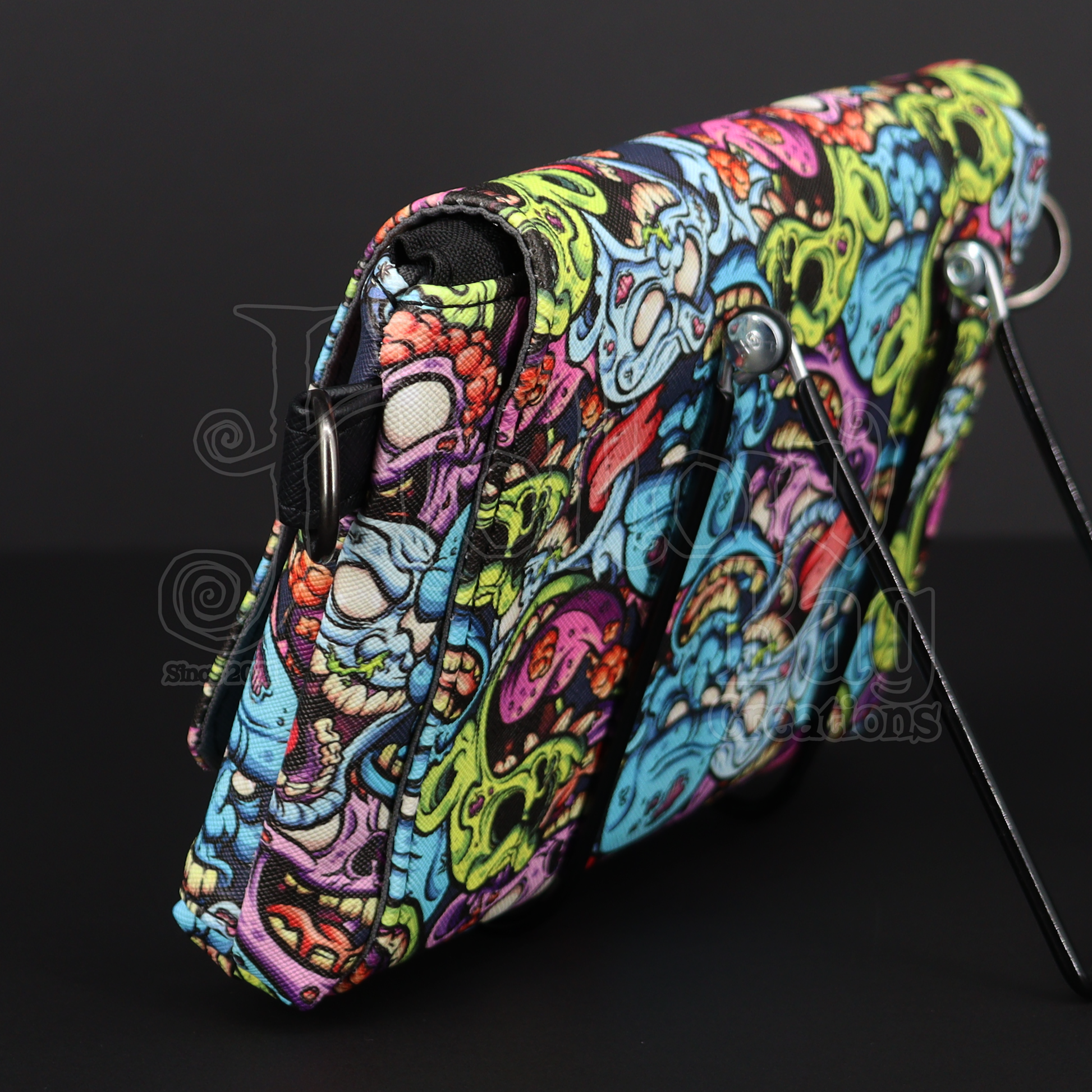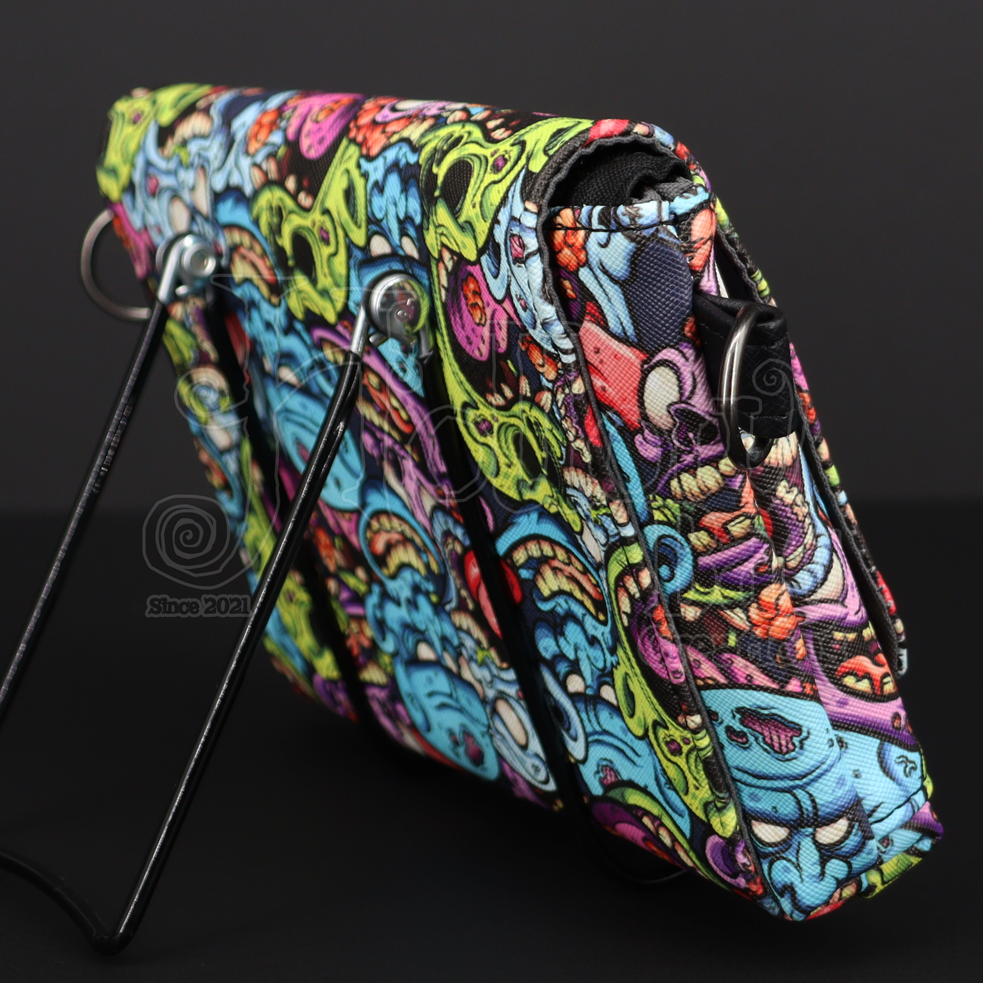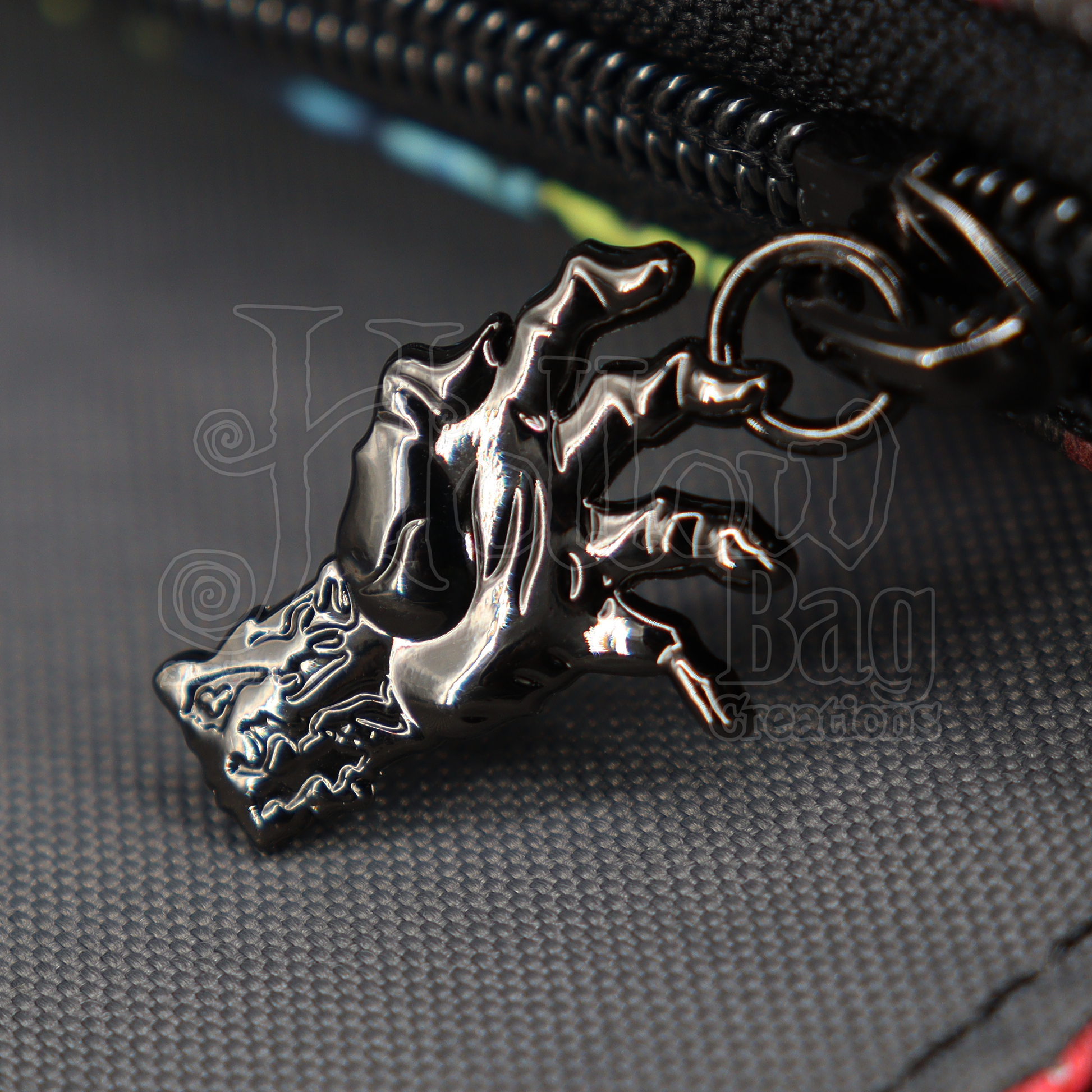 The materials used are custom vinyl for the entire outside and strap, and waterproof canvas on the inside.