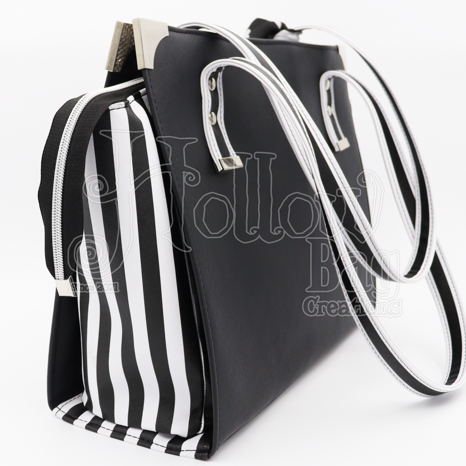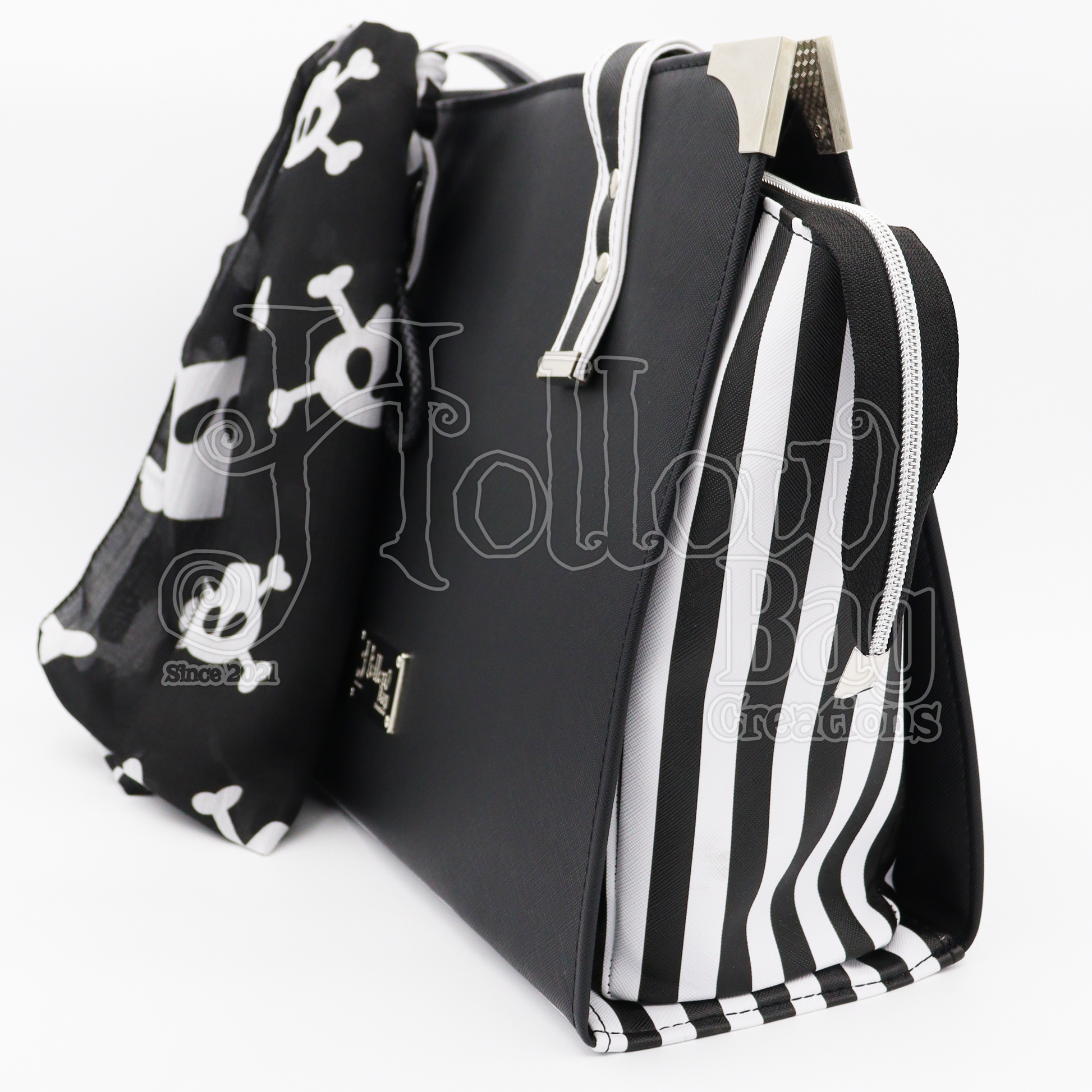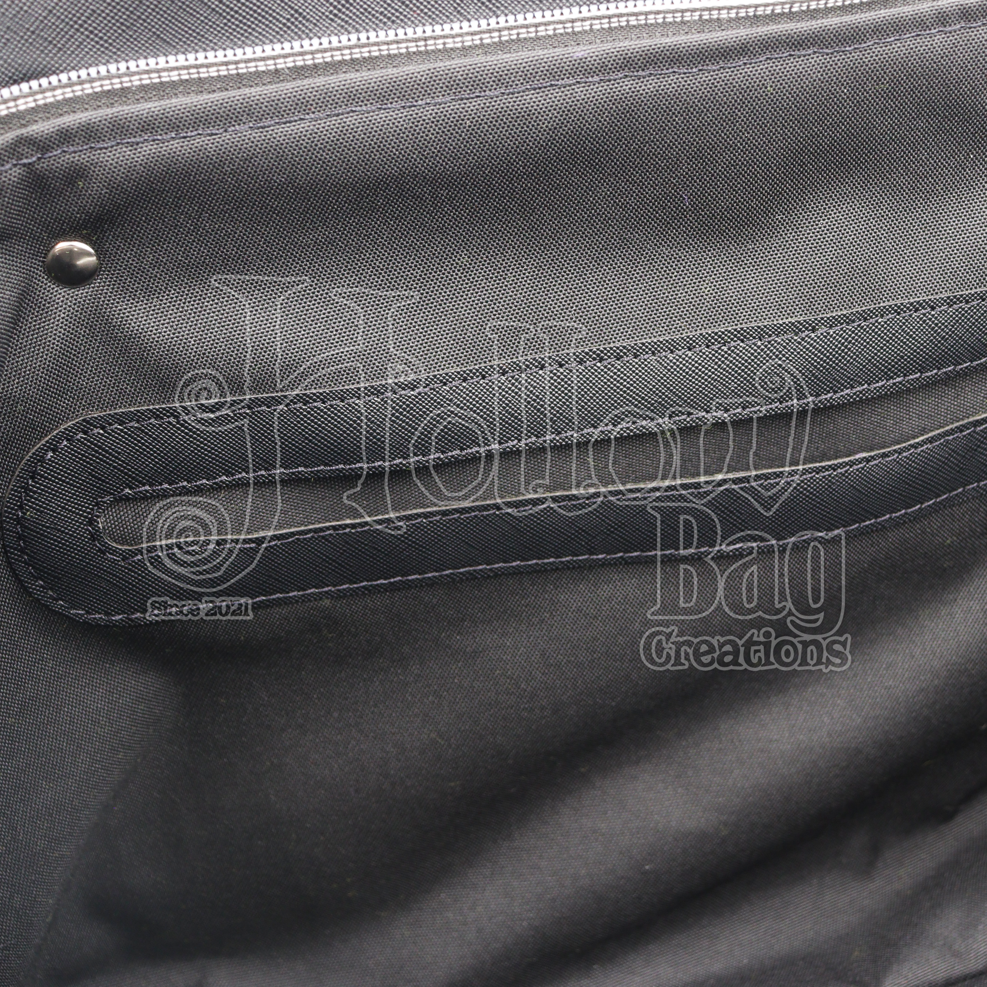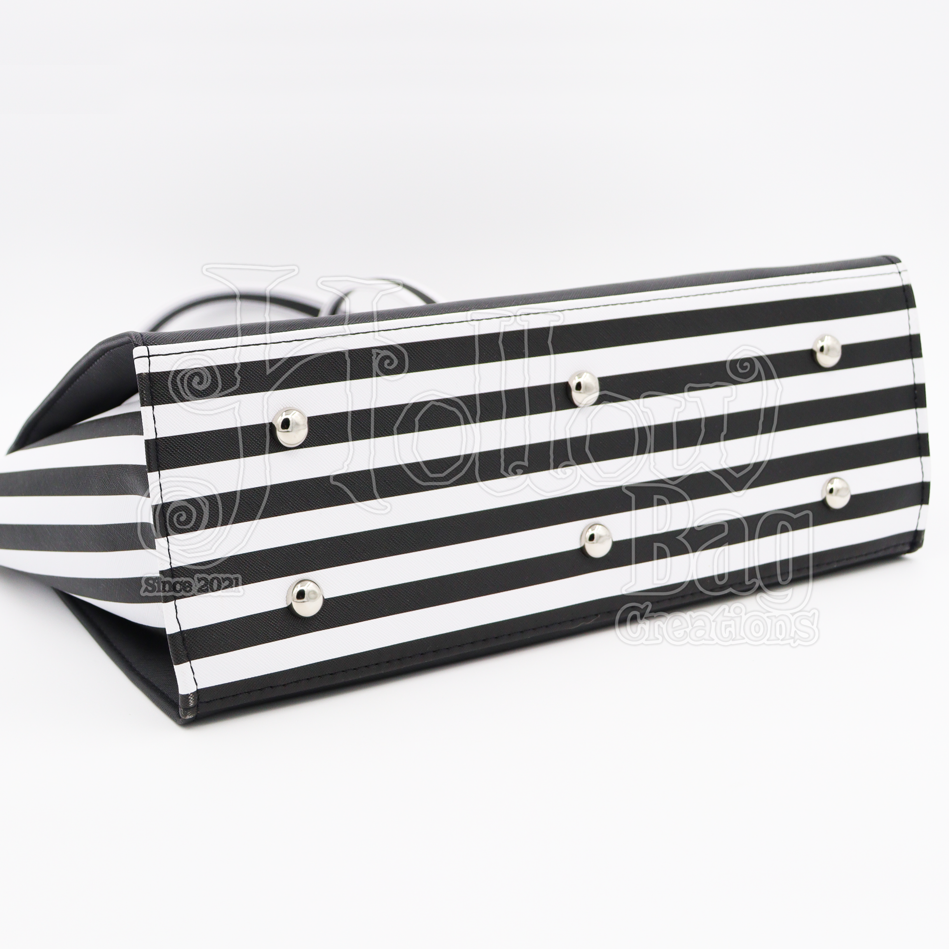 The bag fabrics used are custom vinyl for the entire outside and handles, and waterproof canvas & custom vinyl on the inside.