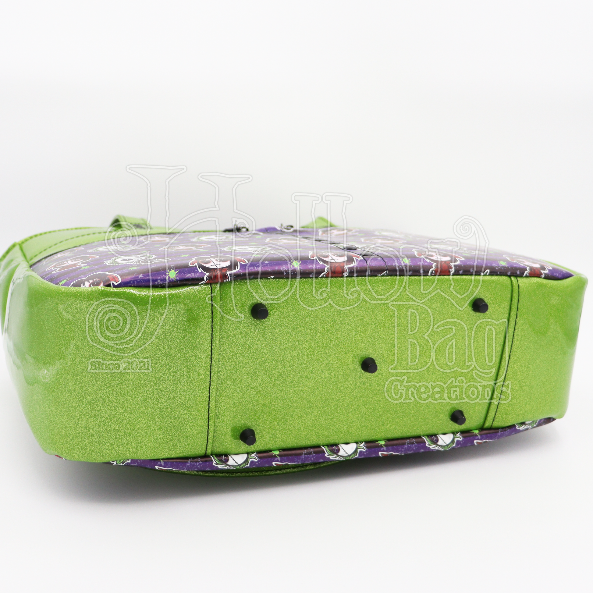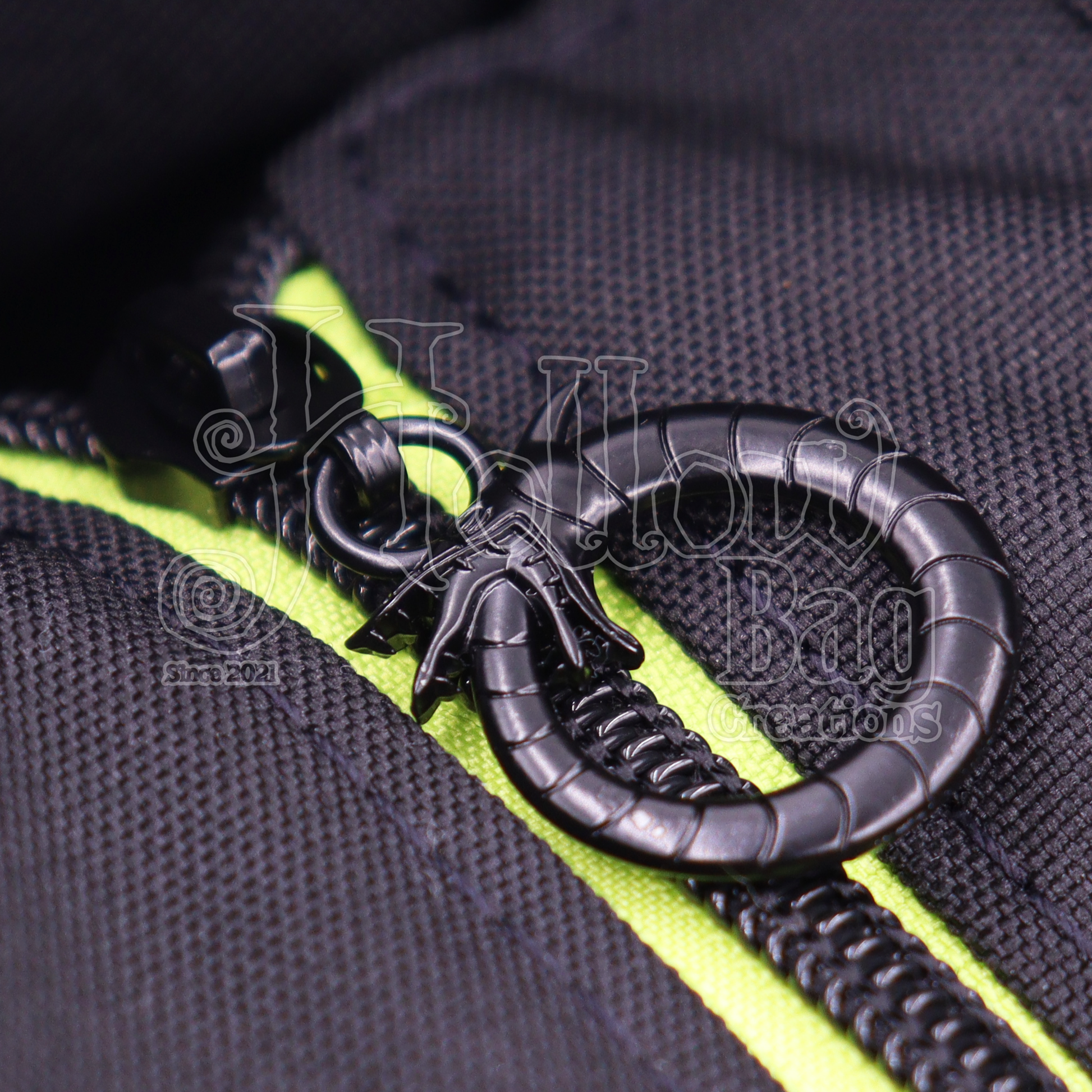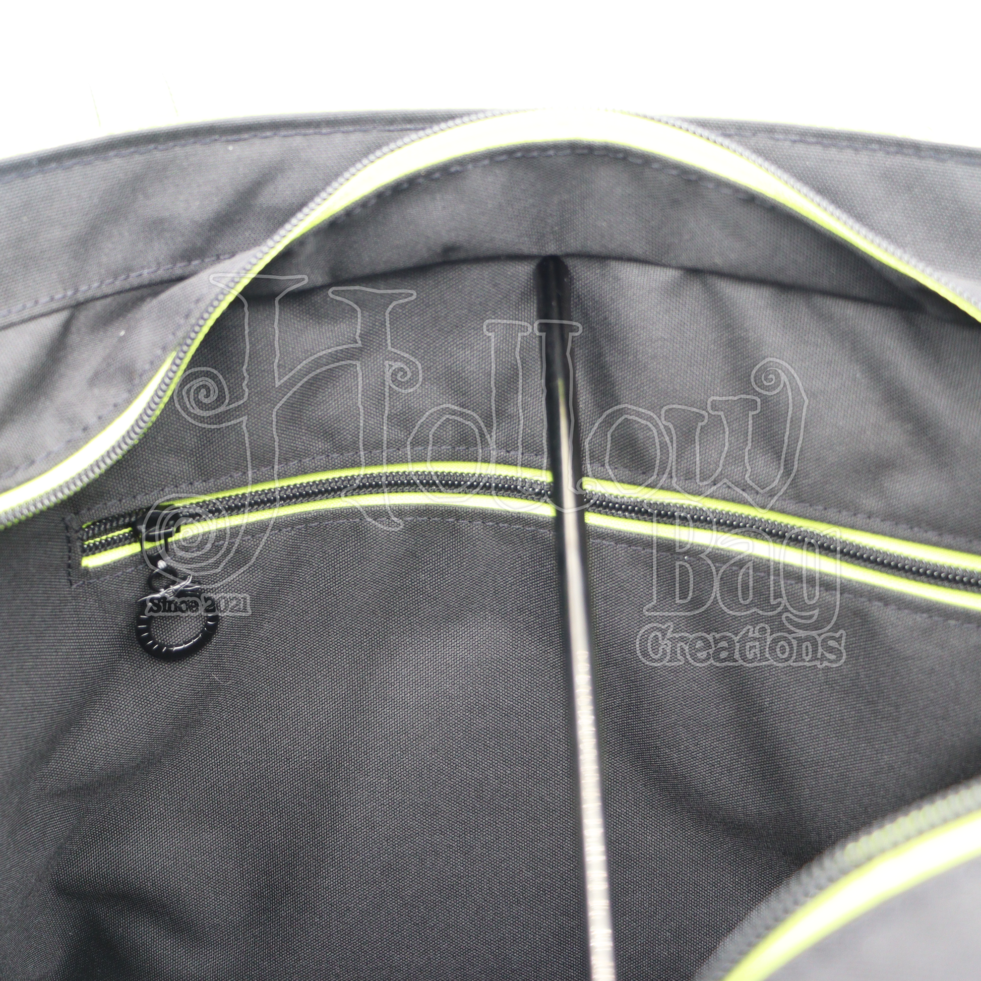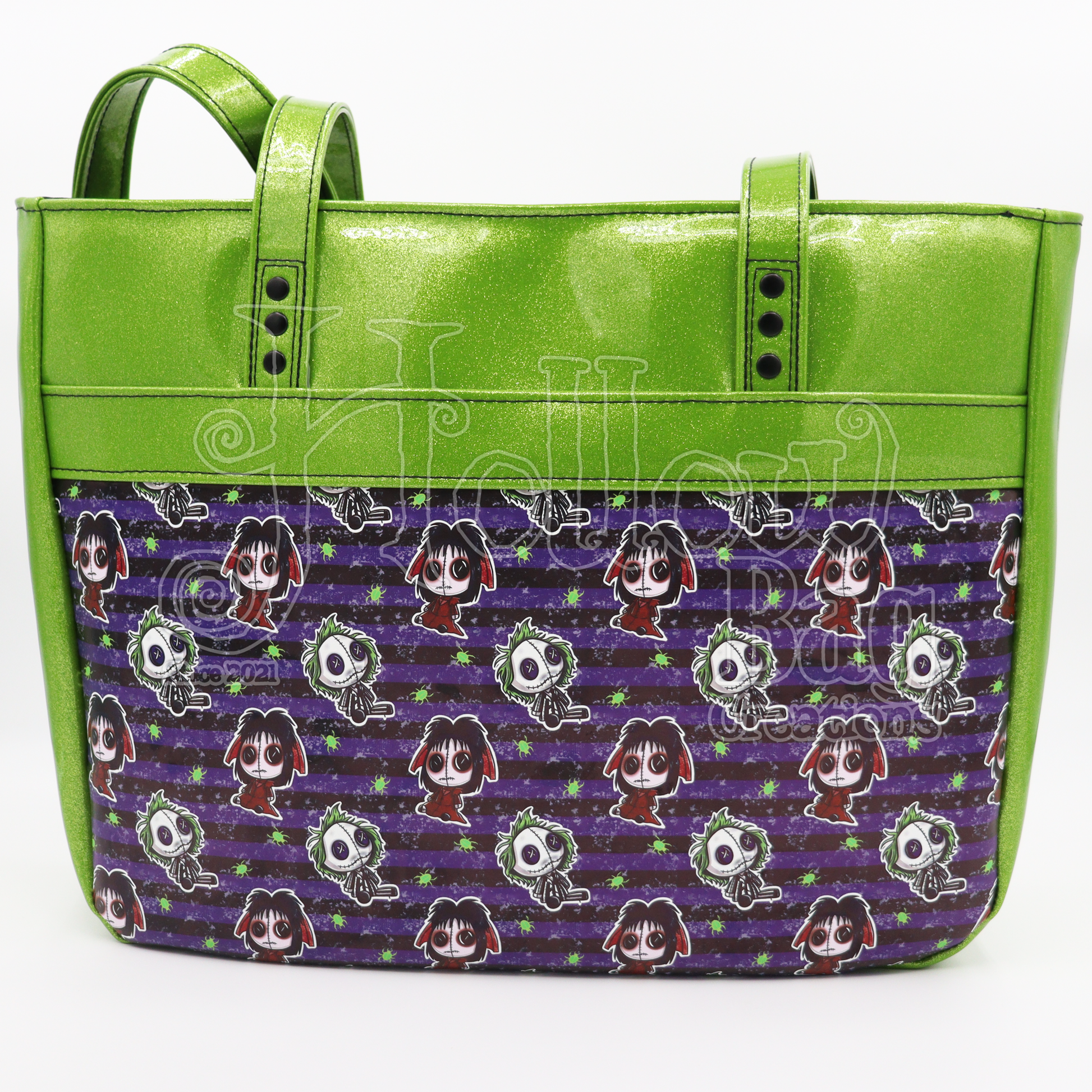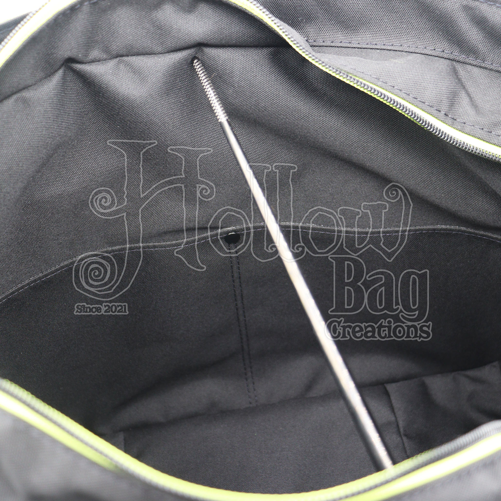 The bag fabrics used are custom vinyl for the entire outside and handles, and waterproof canvas on the inside.
