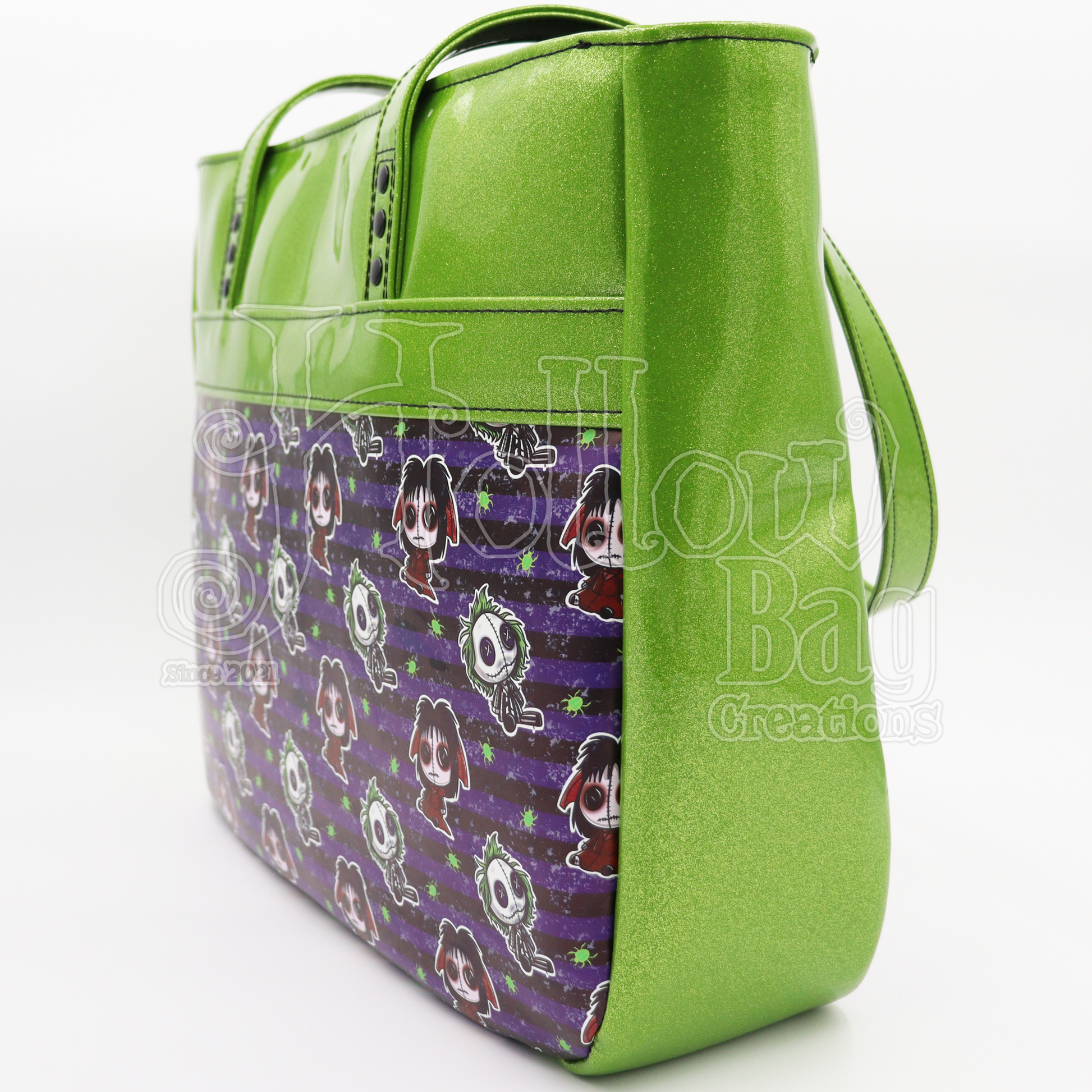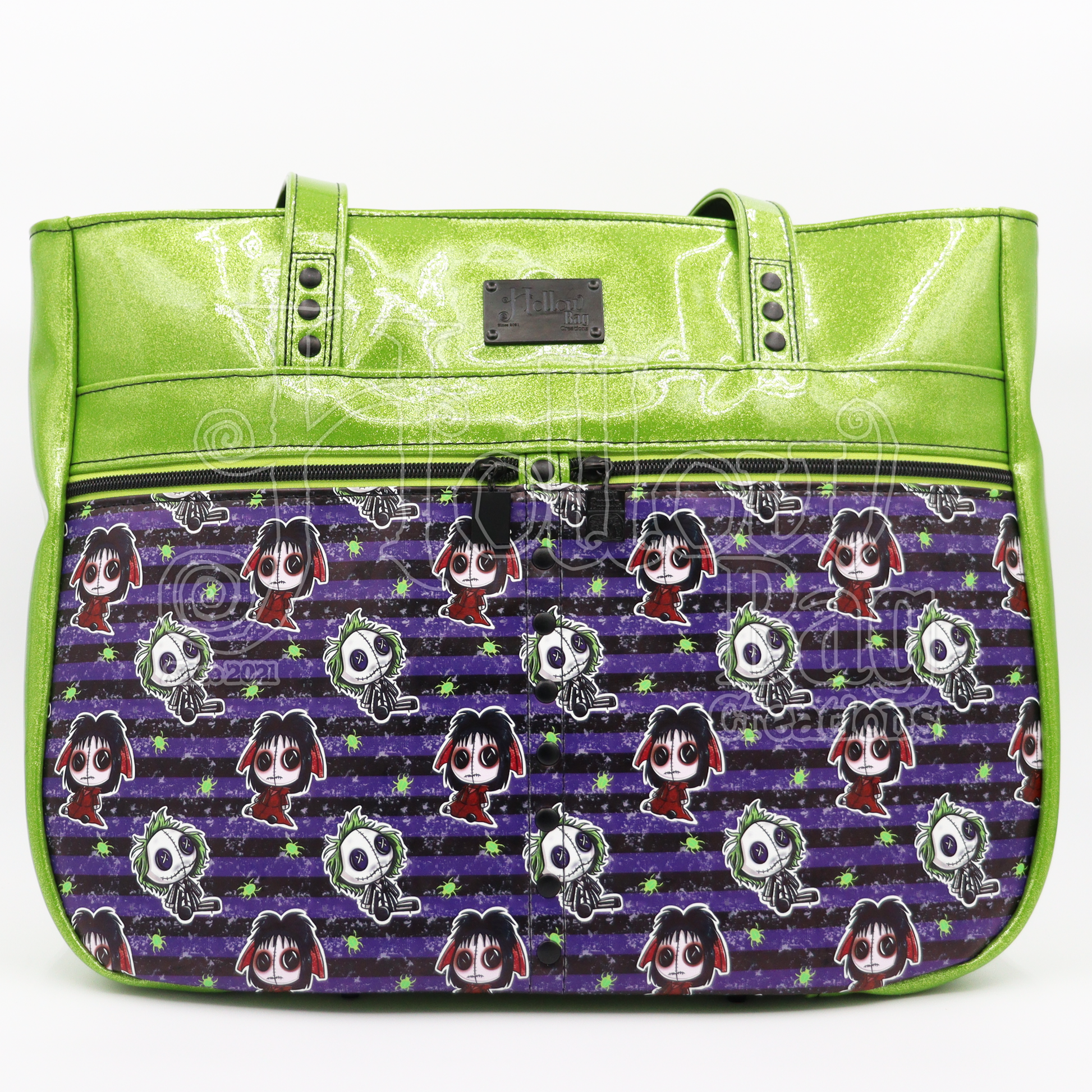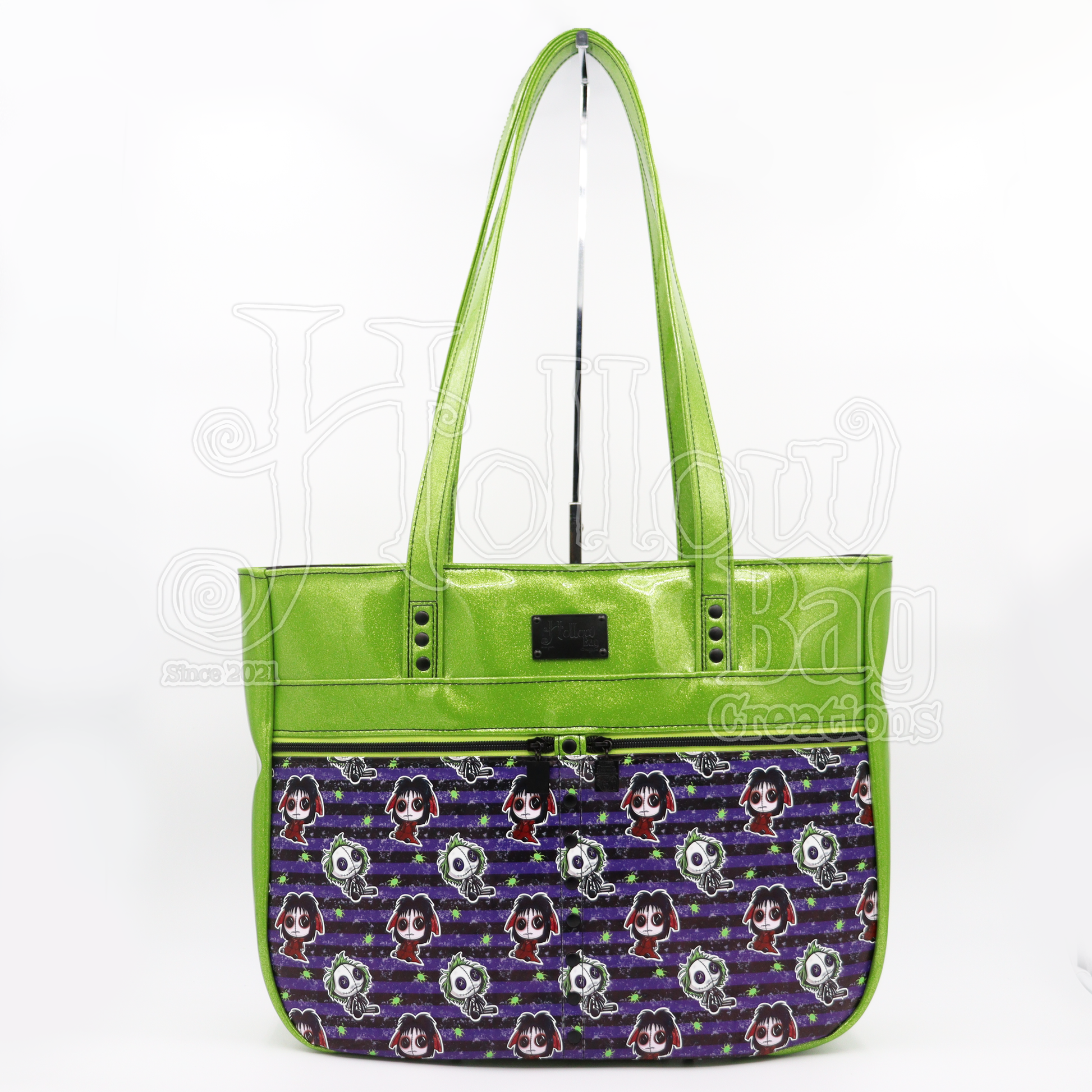 This large bag measures approx 16" long, 5.5" wide, up to 12" deep, and is 13" tall (28" including the handles). It's considered a "deluxe" tote due to the custom materials and all of the extra pockets.