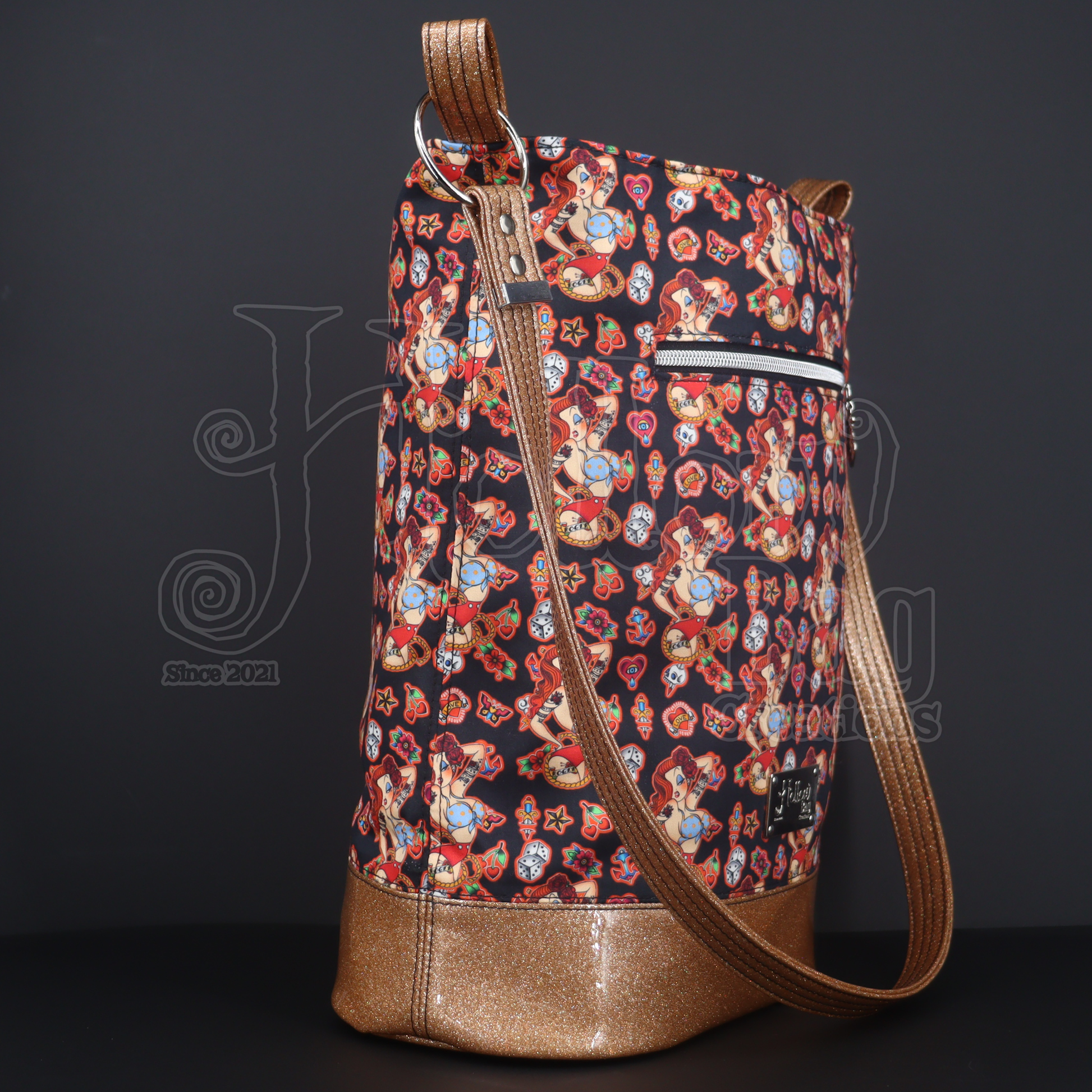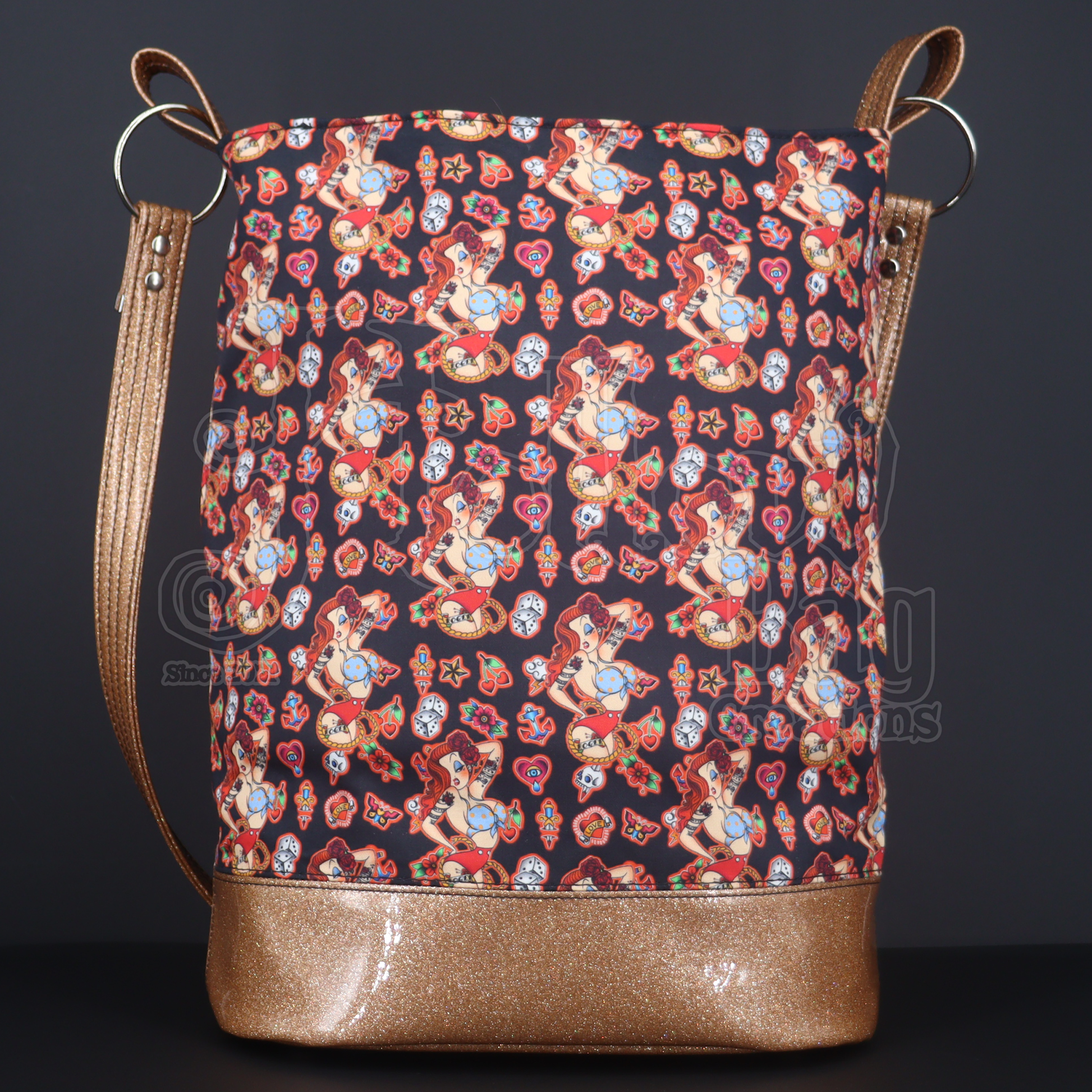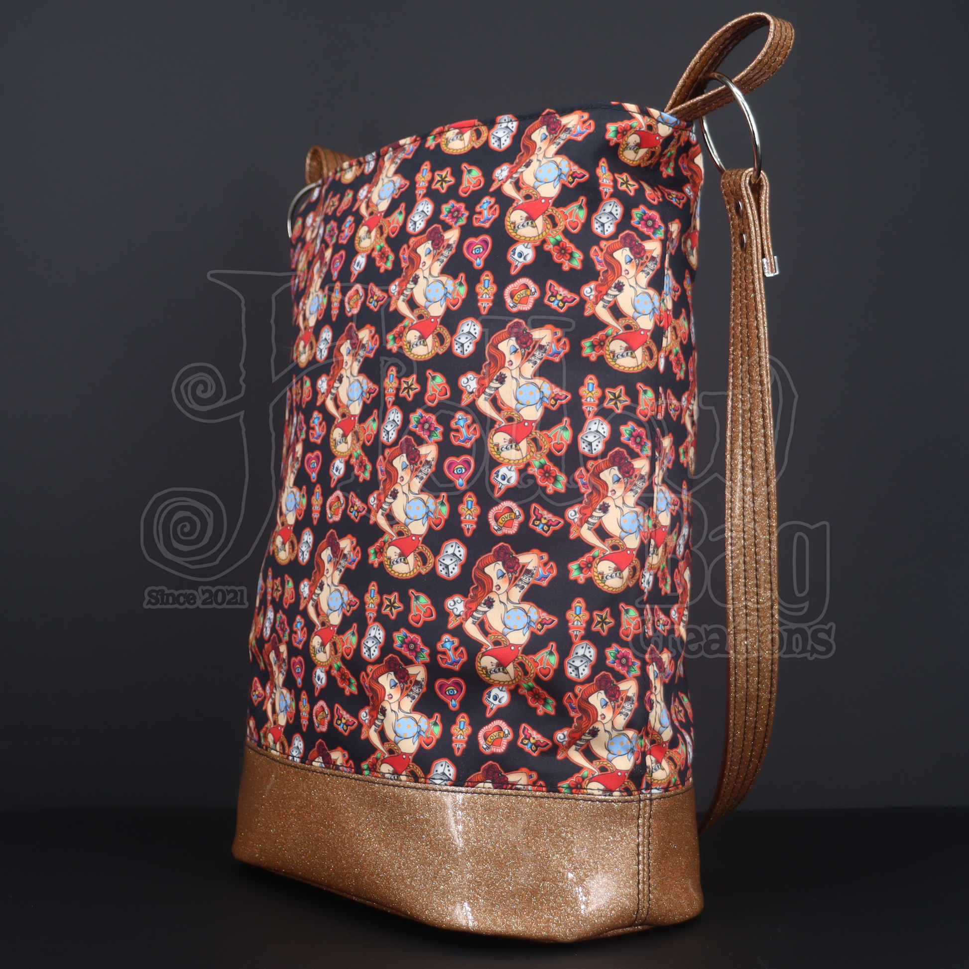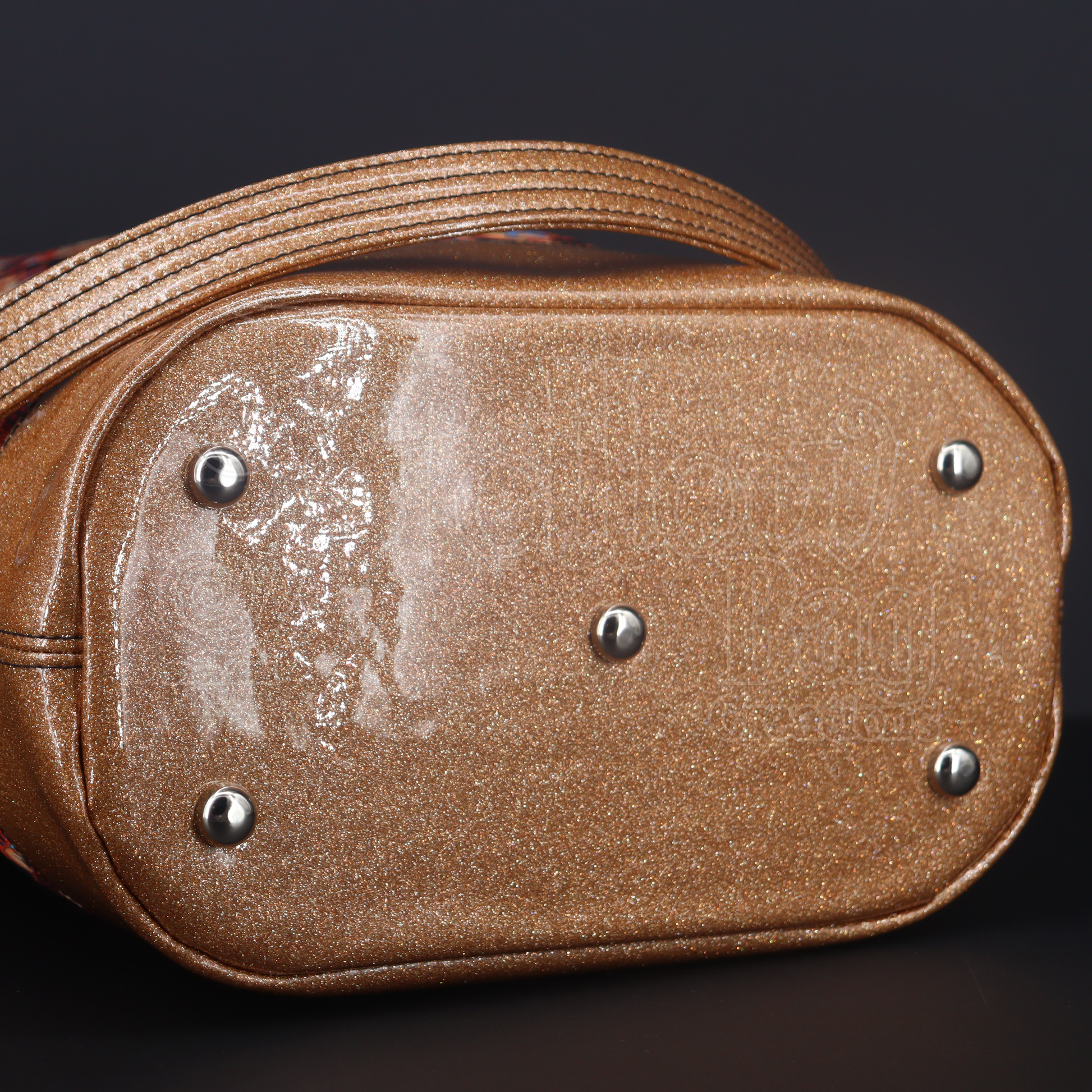 The bag fabrics used are custom glitter vinyl and cotton for the entire outside and handle, with waterproof canvas for the inner lining.