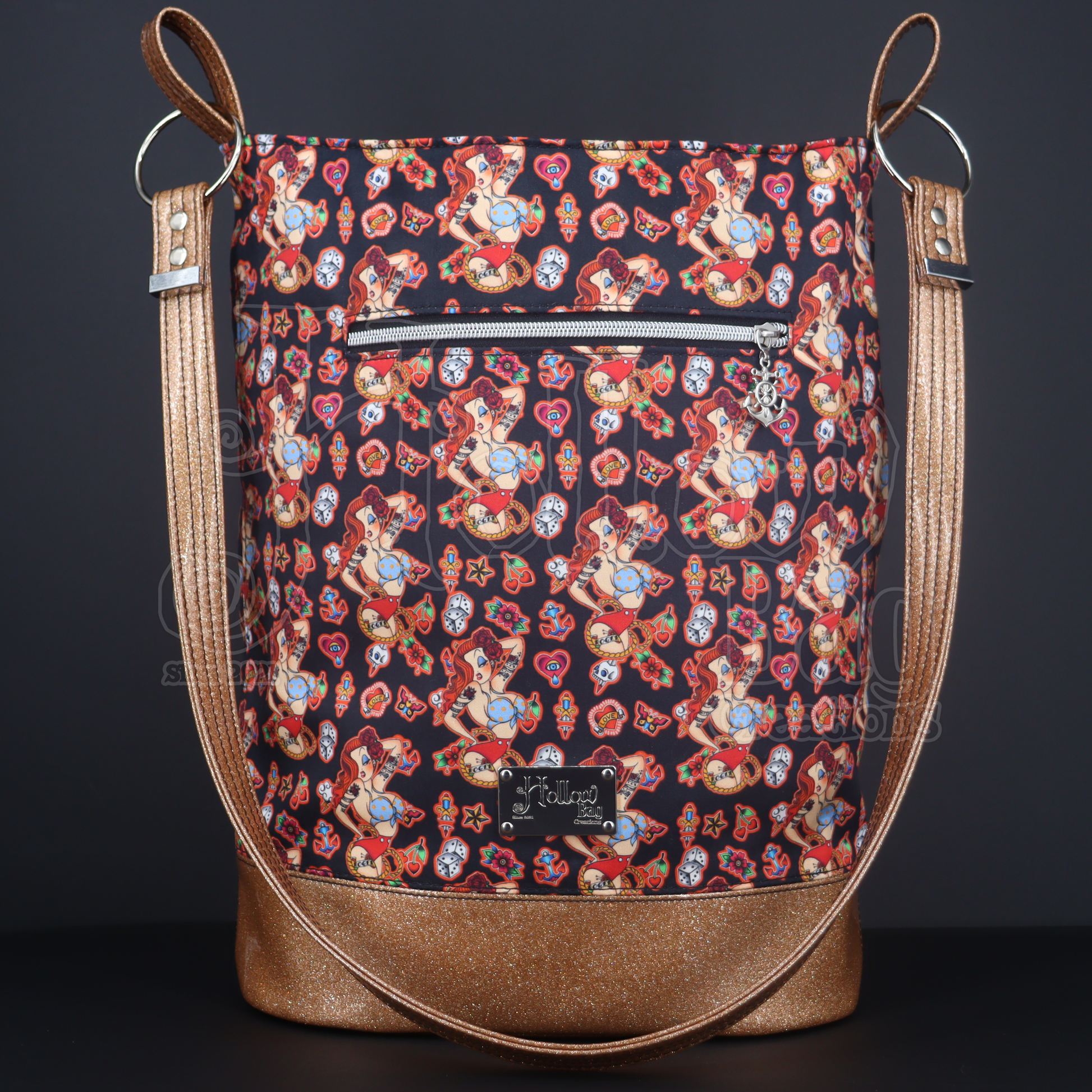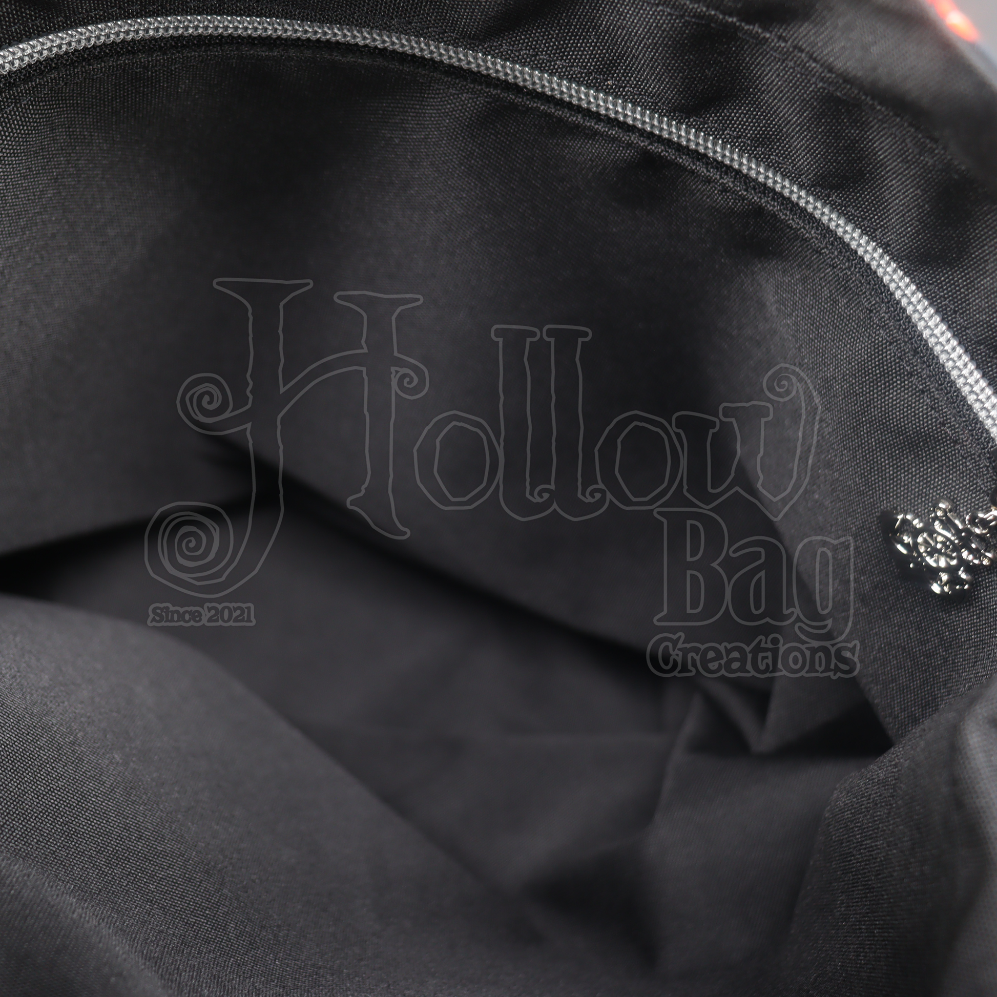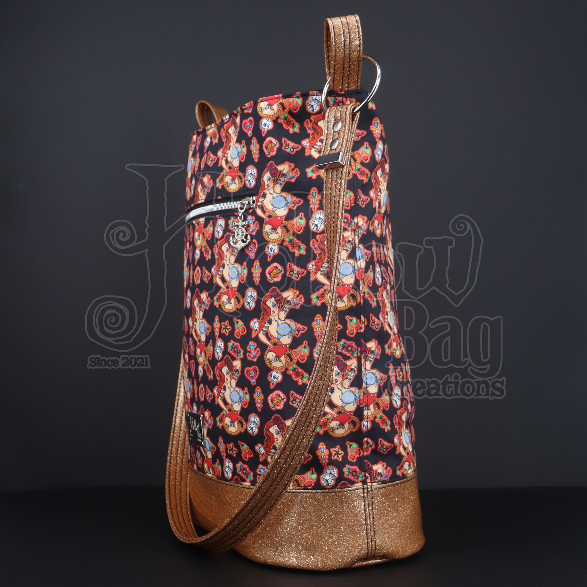 The bag fabrics used are custom glitter vinyl and cotton for the entire outside and handle, with waterproof canvas for the inner lining.