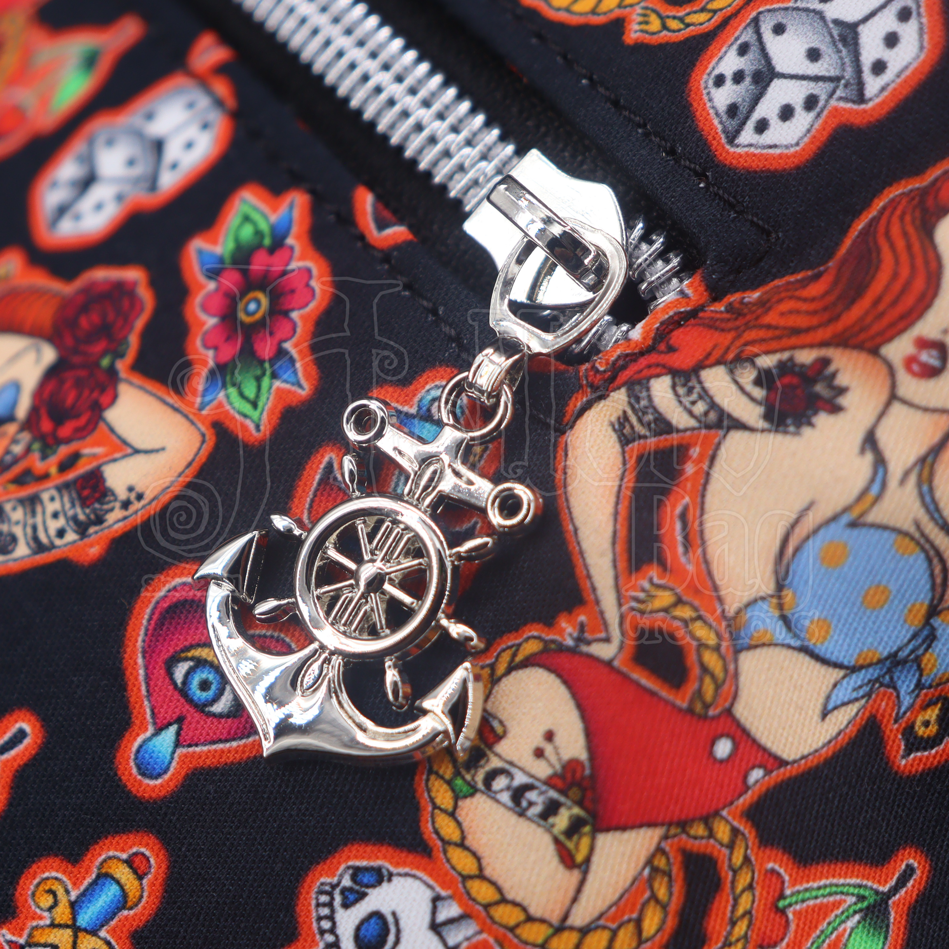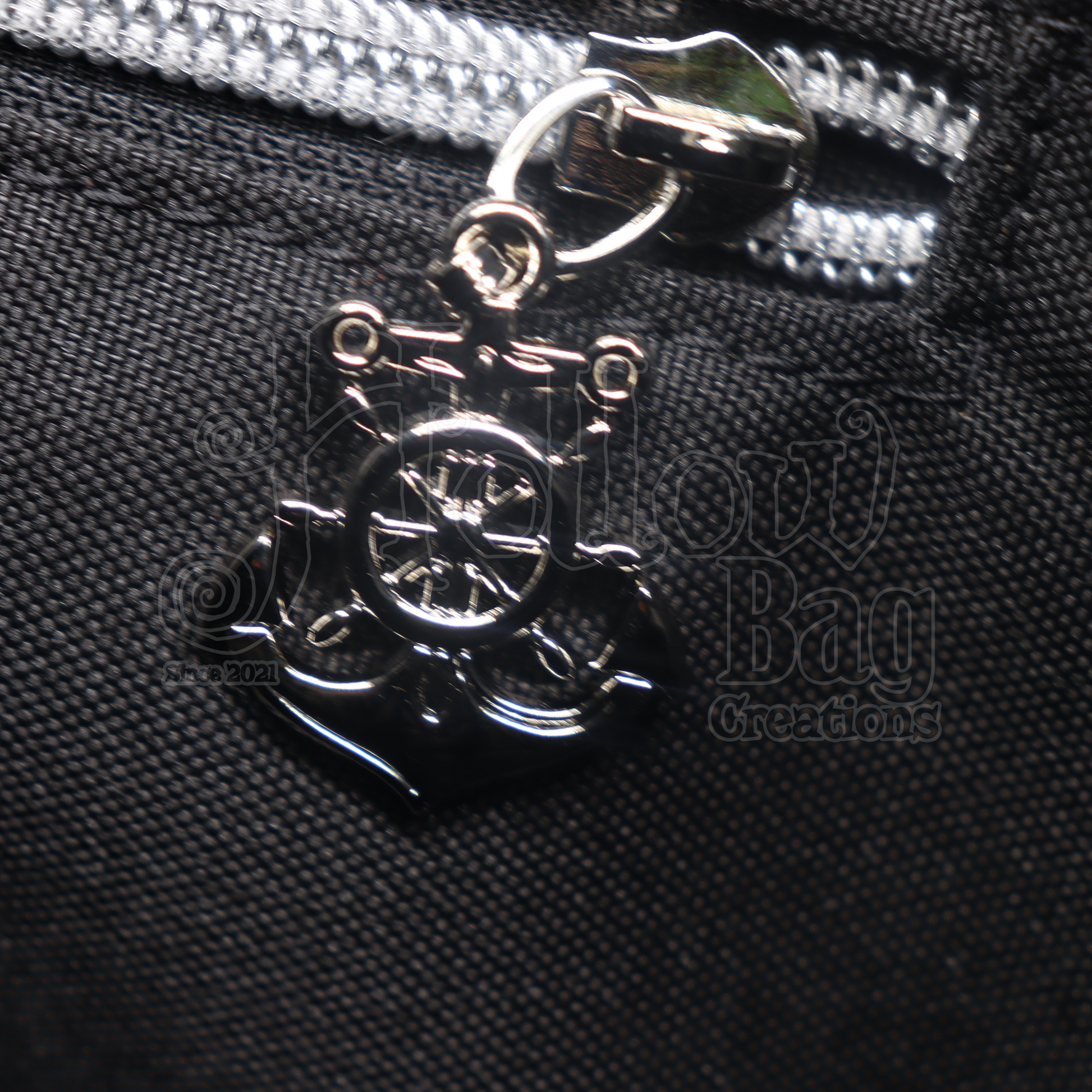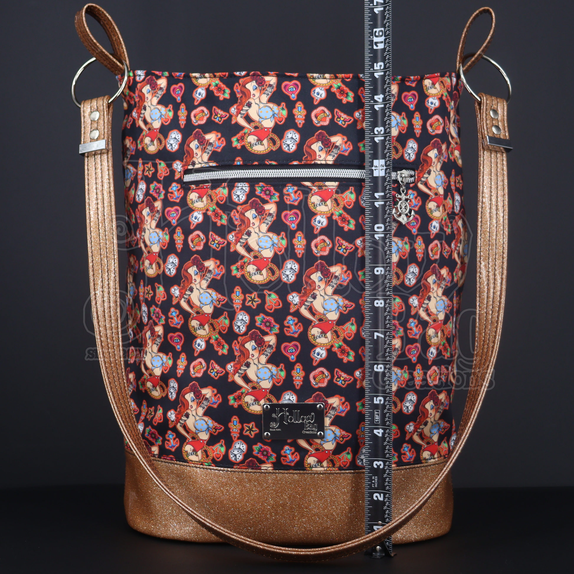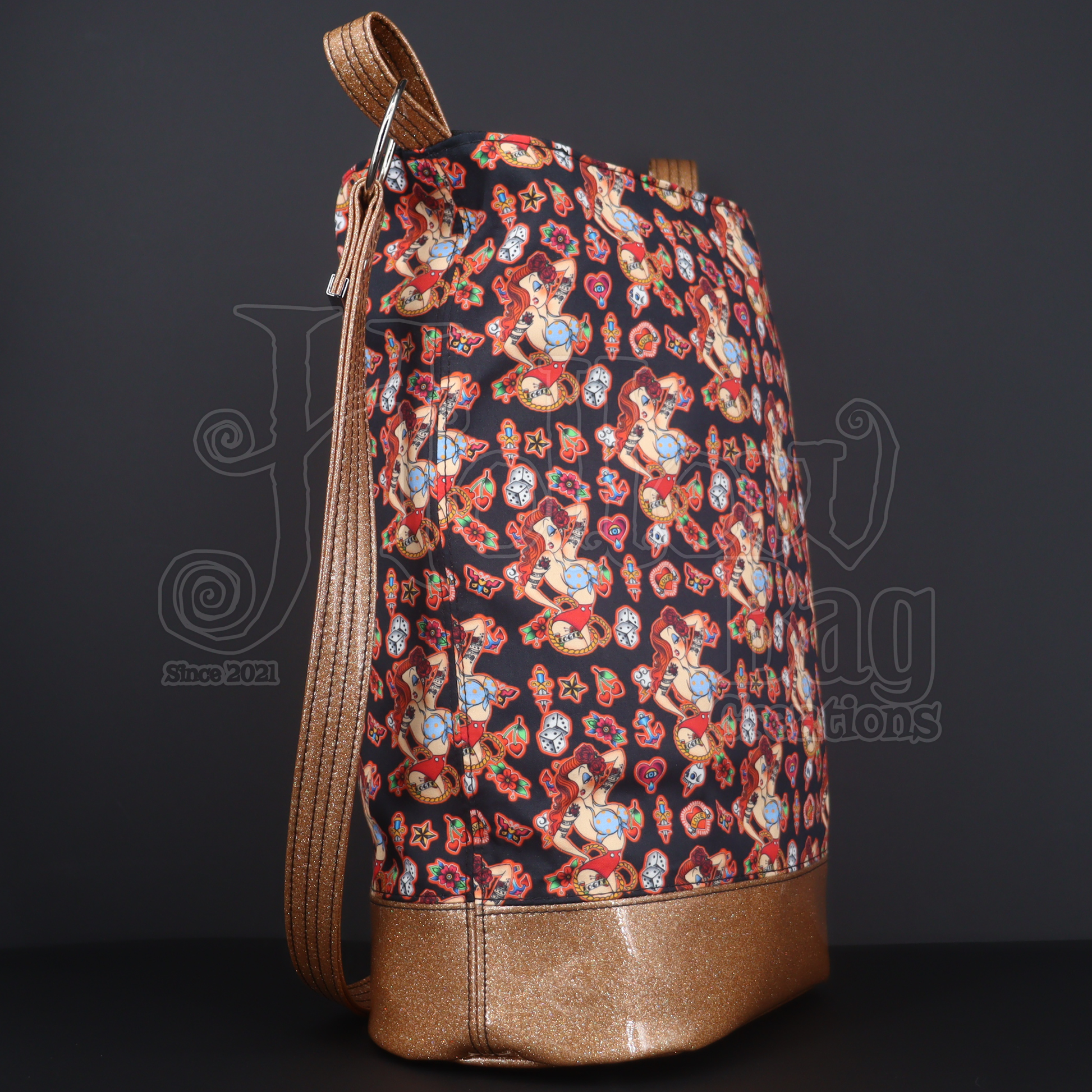 The bag fabrics used are custom glitter vinyl and cotton for the entire outside and handle, with waterproof canvas for the inner lining.