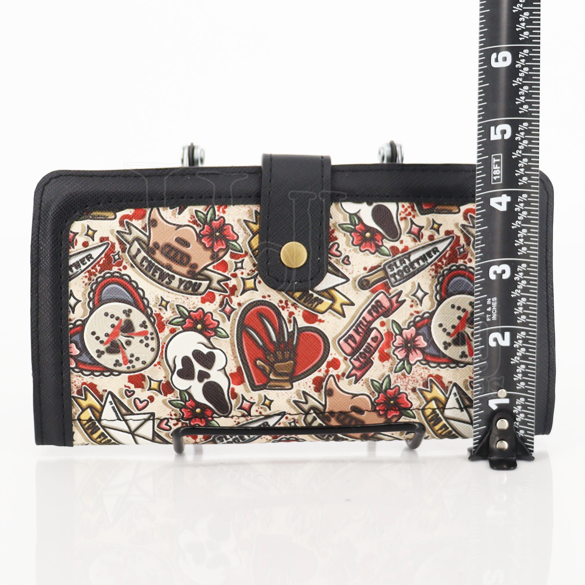 This wallet measures approx 7" wide, and 4" tall
