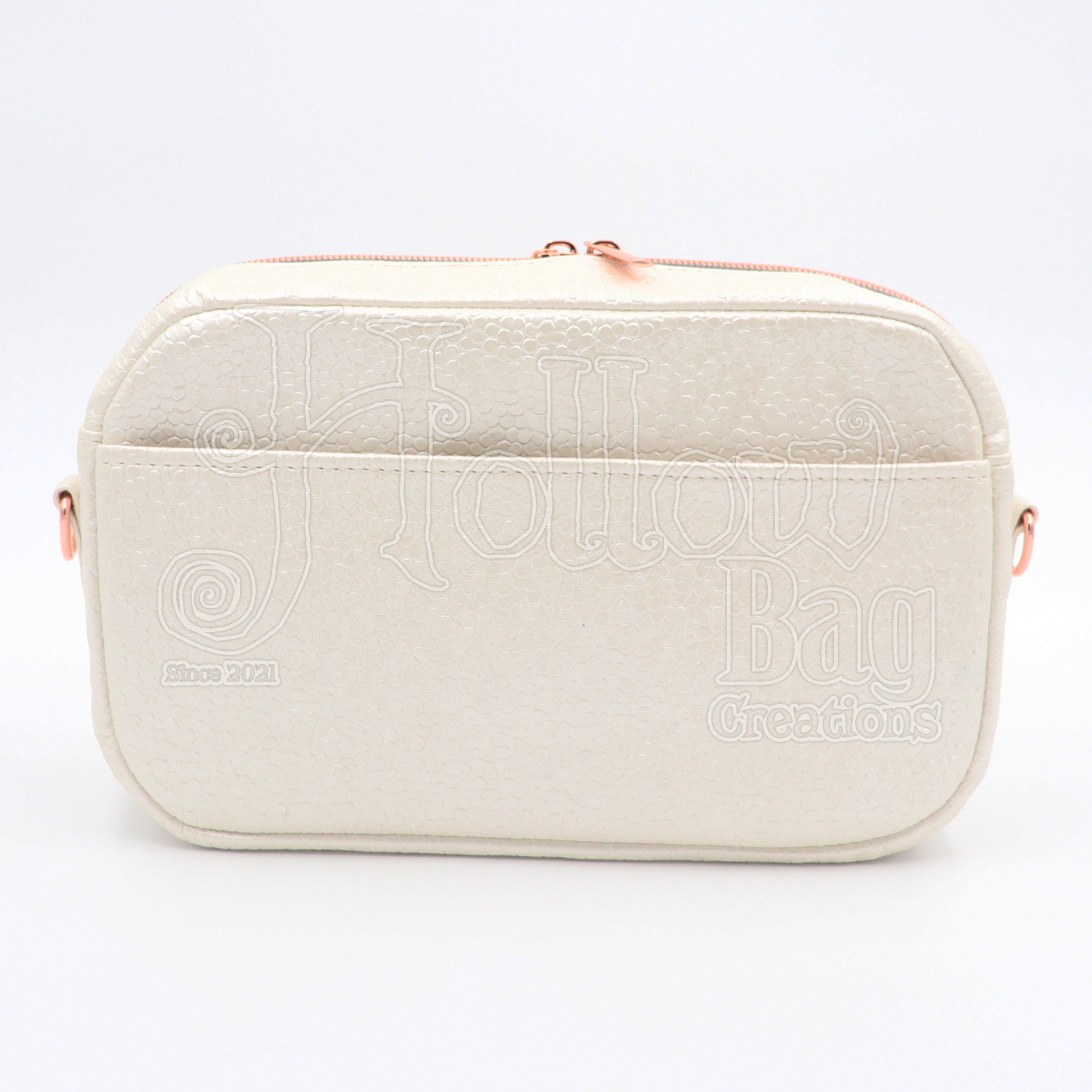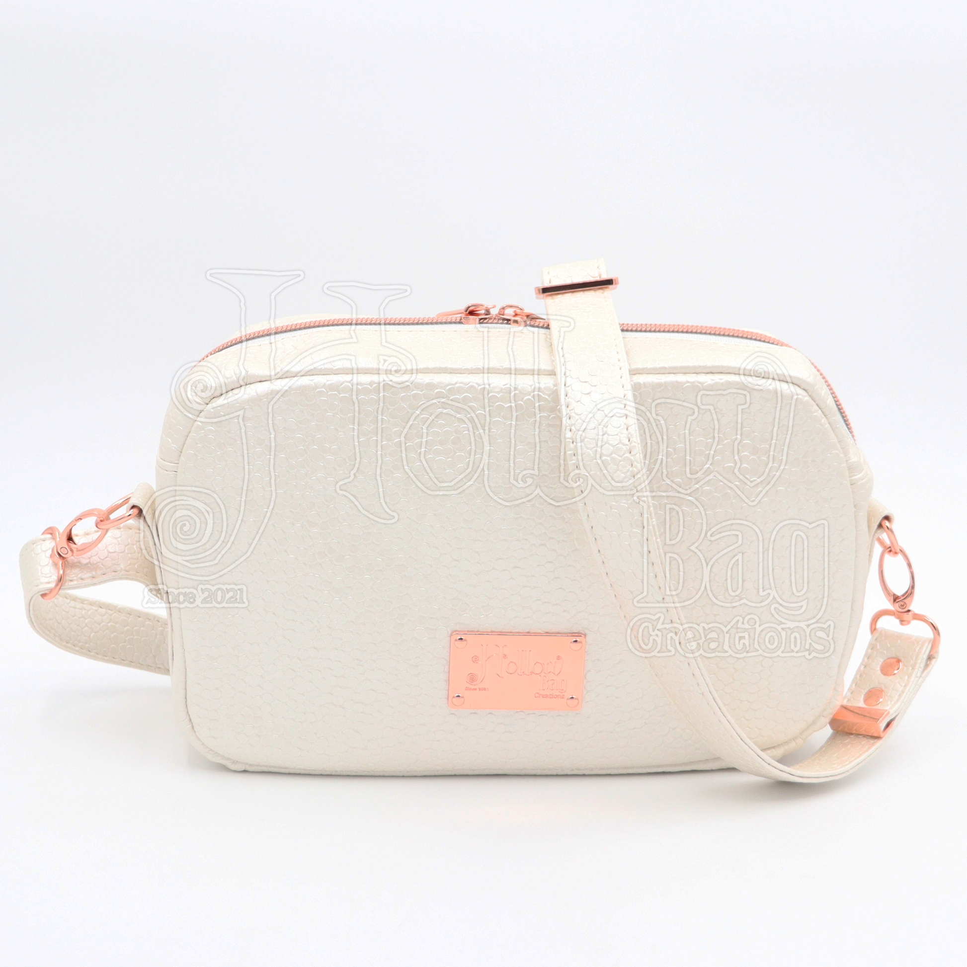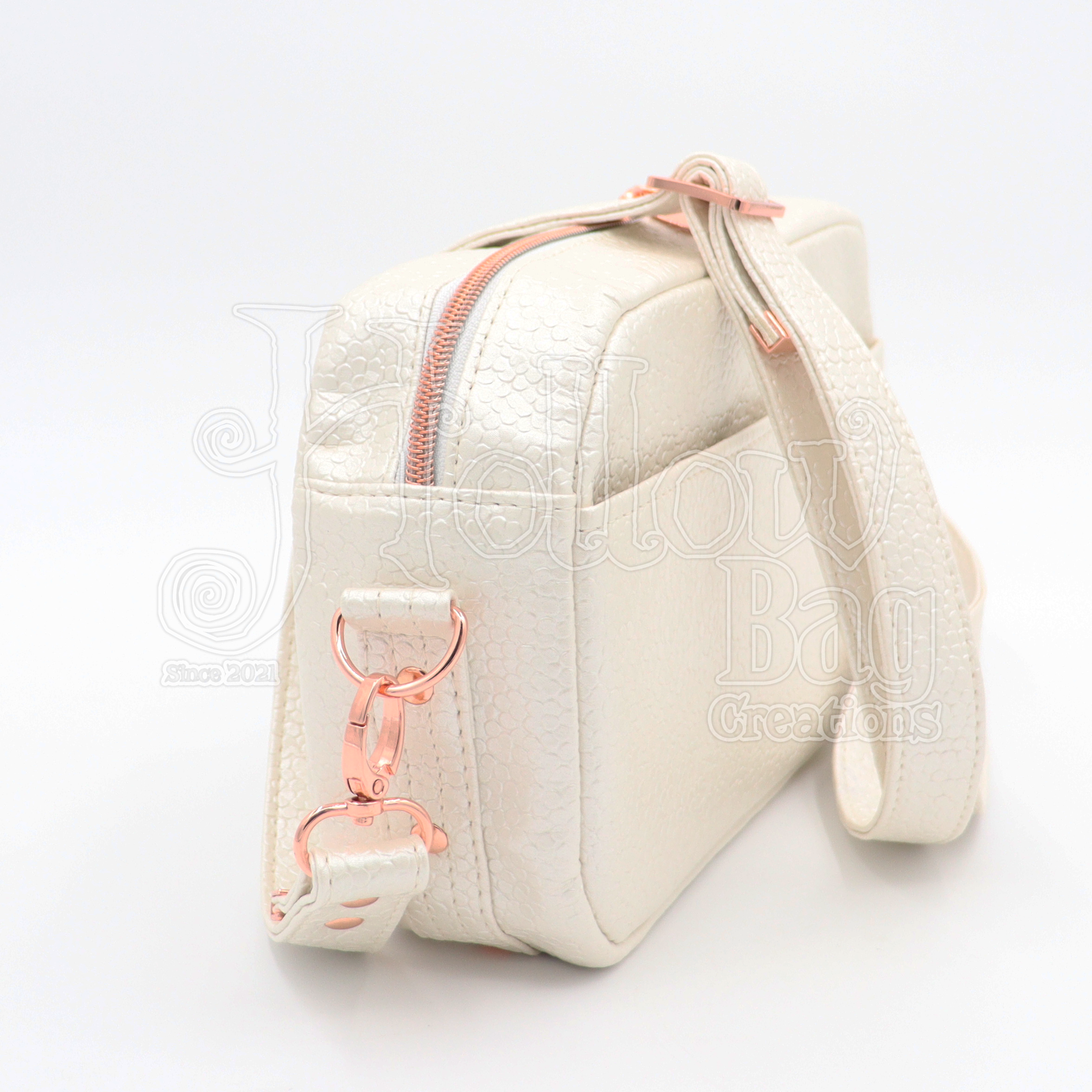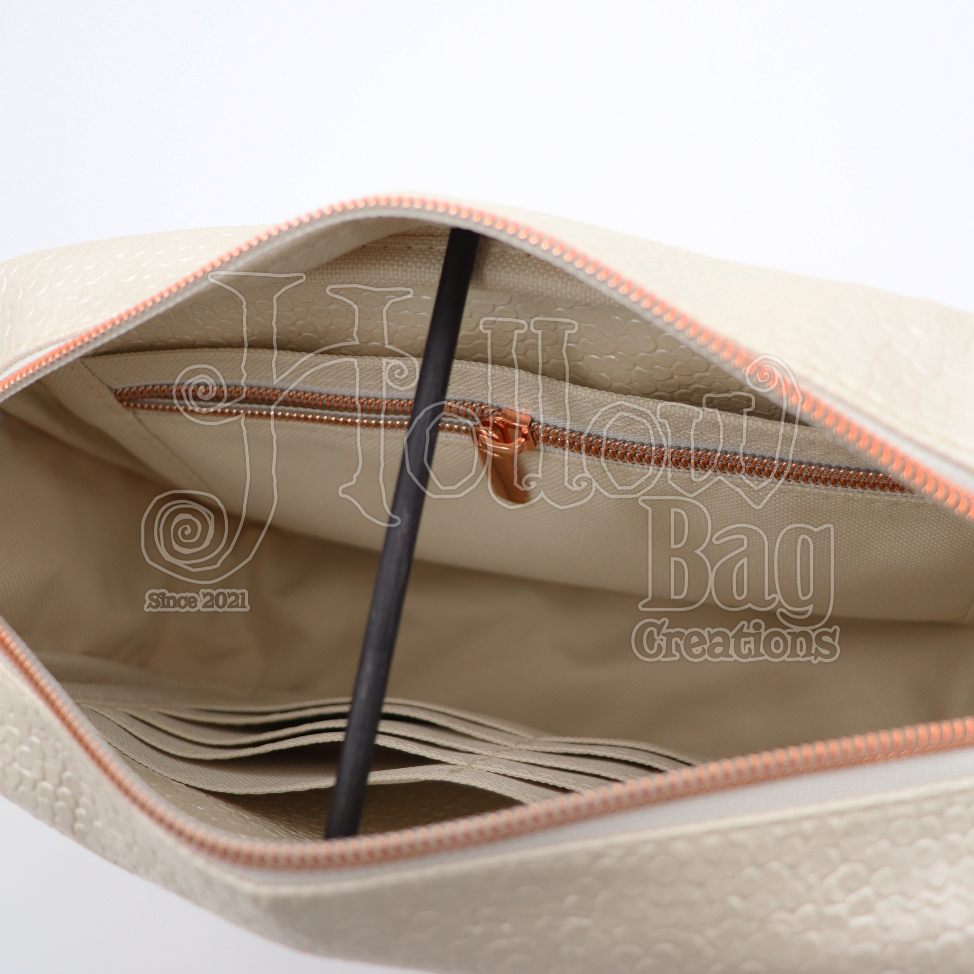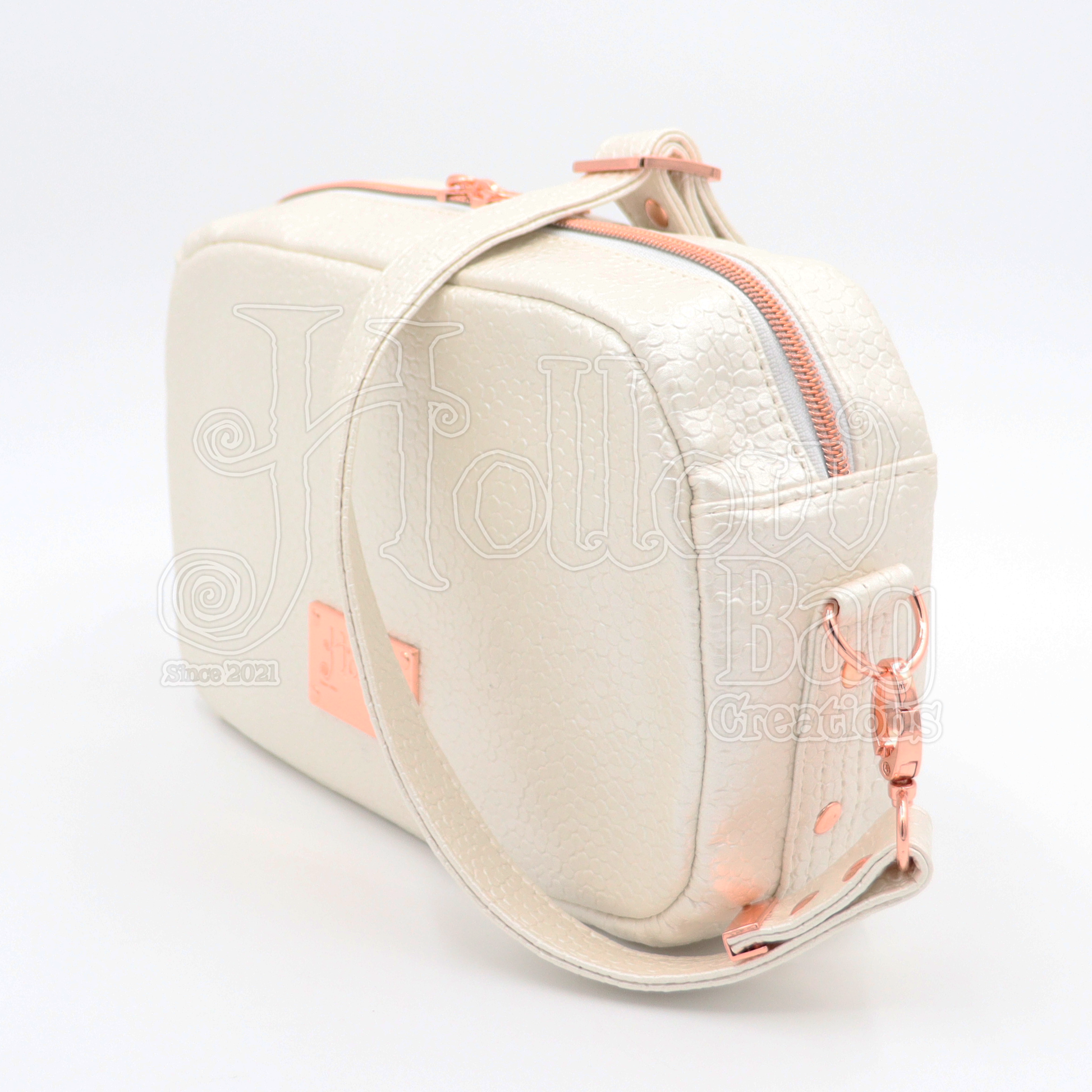 The materials used are custom vinyl for the entire outside and strap, with waterproof canvas on the inside.