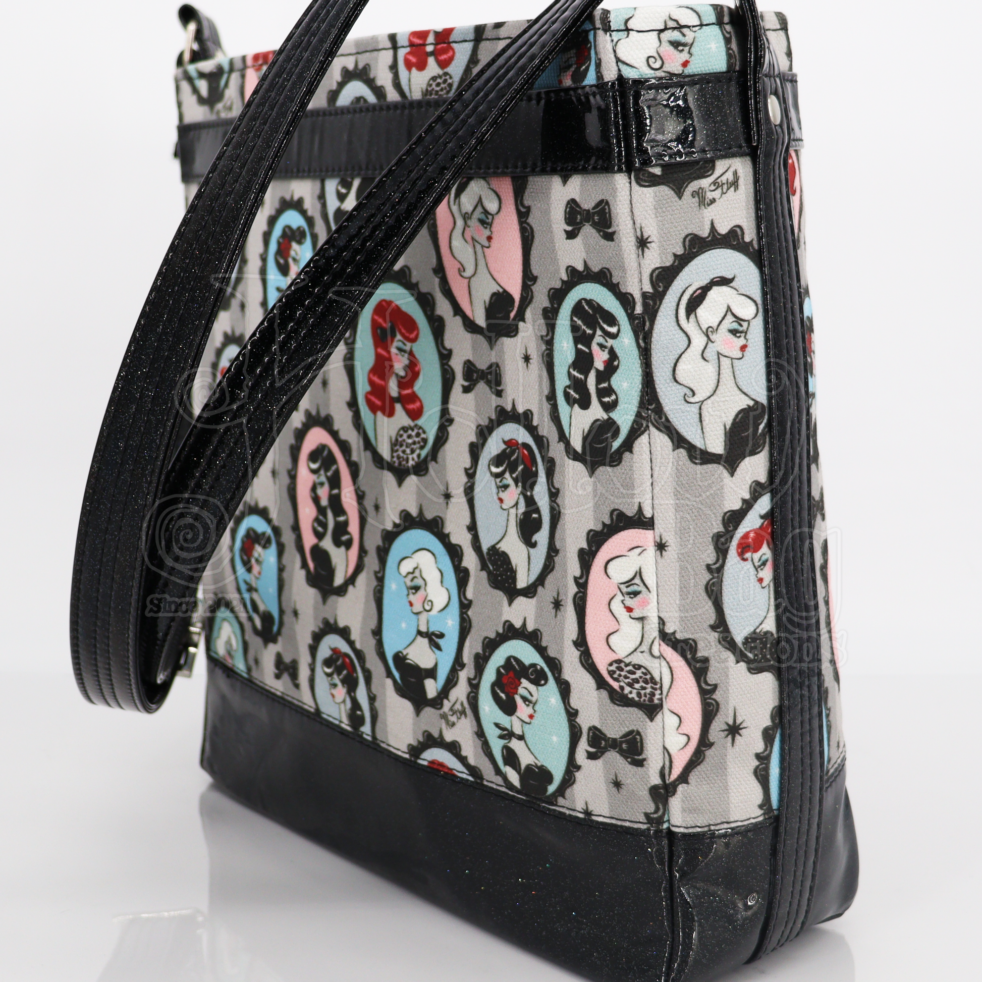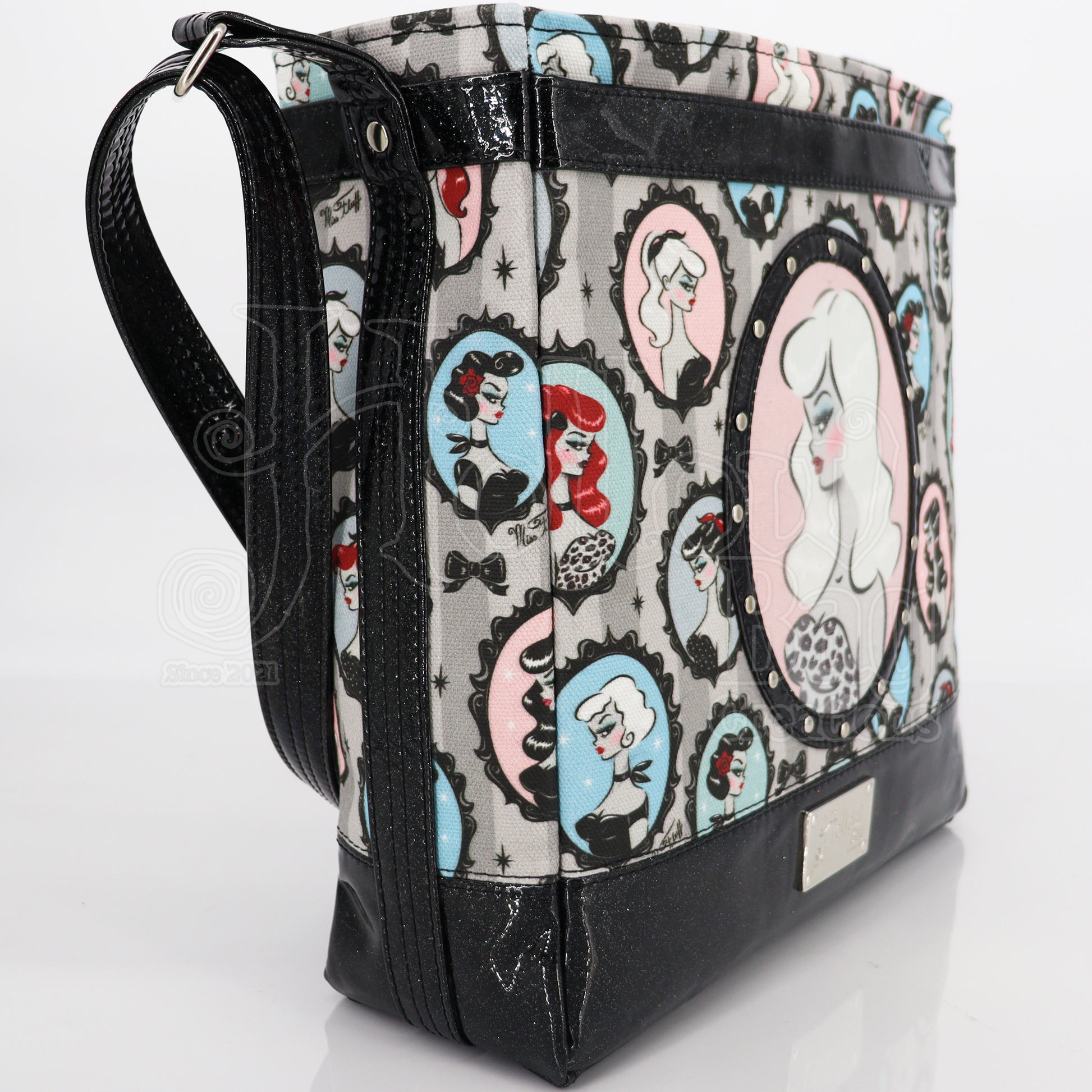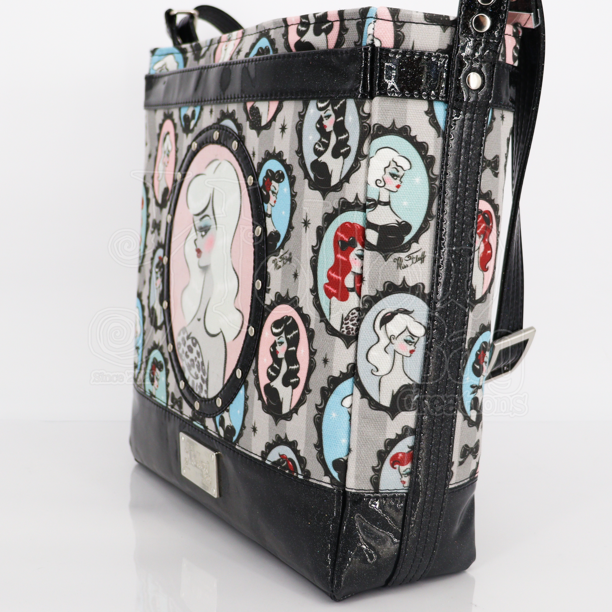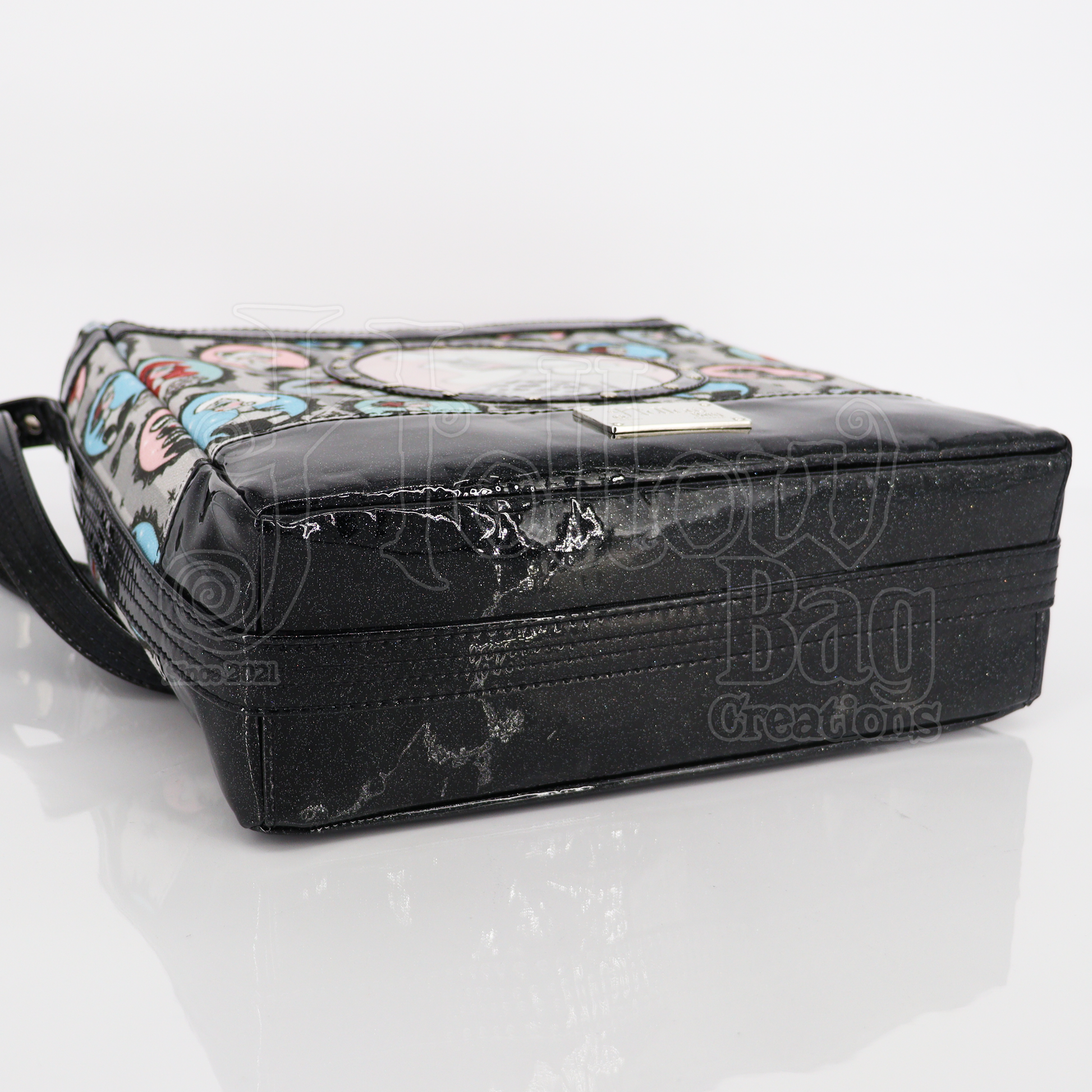 The bag fabrics used are custom glitter vinyl and cotton canvas for the entire outside and handles, with waterproof canvas on the inside. Large ipads & tablets, as well as some laptops, will fit inside!