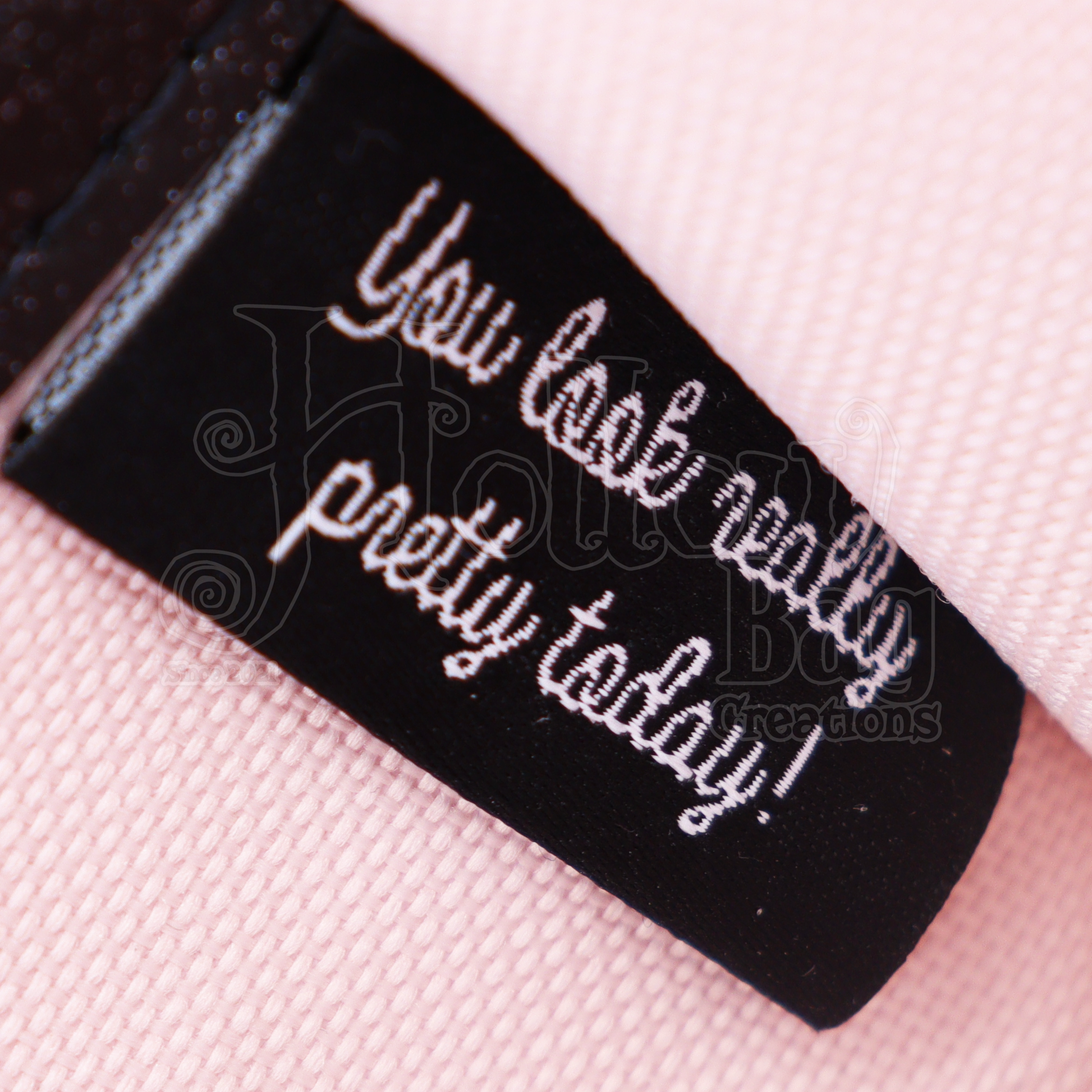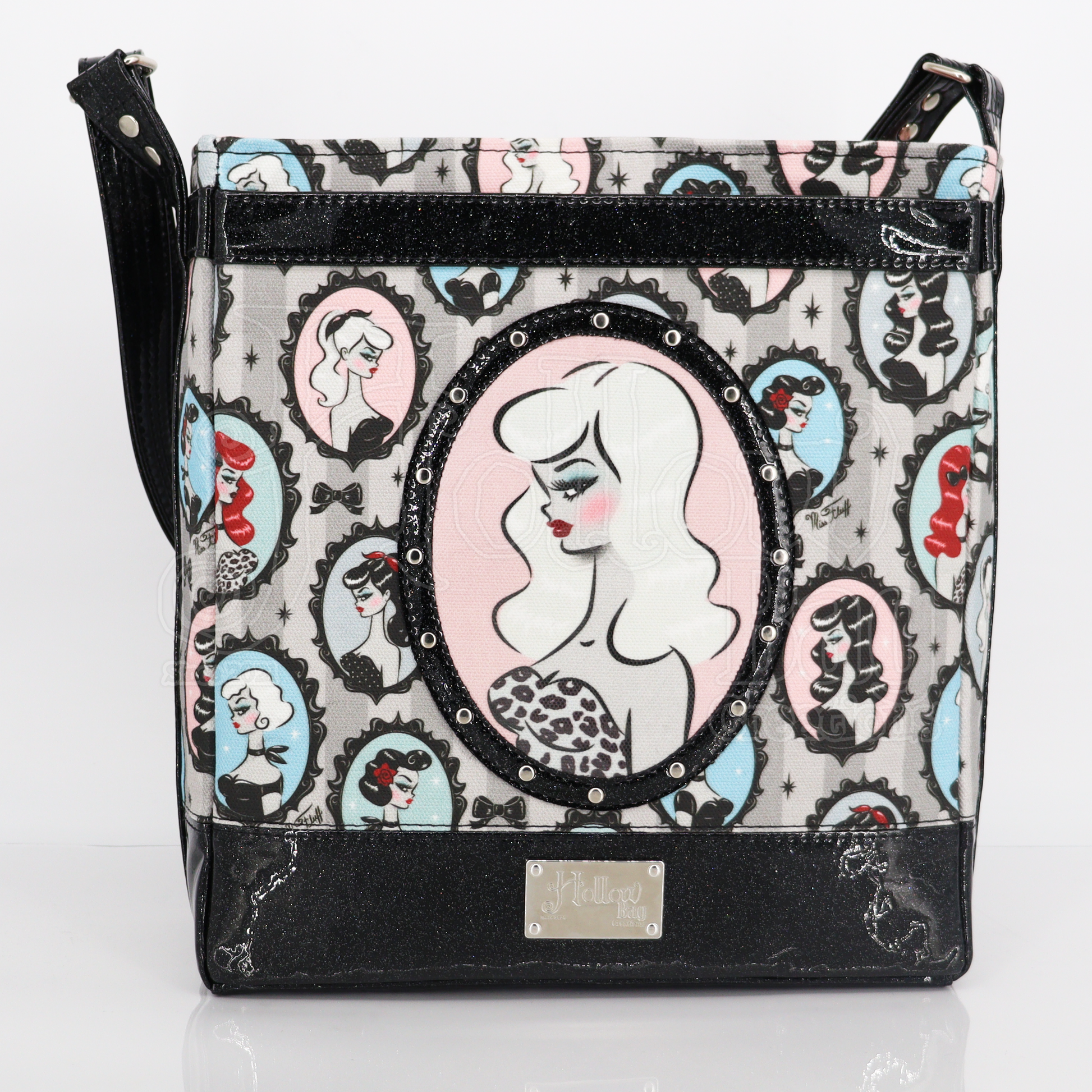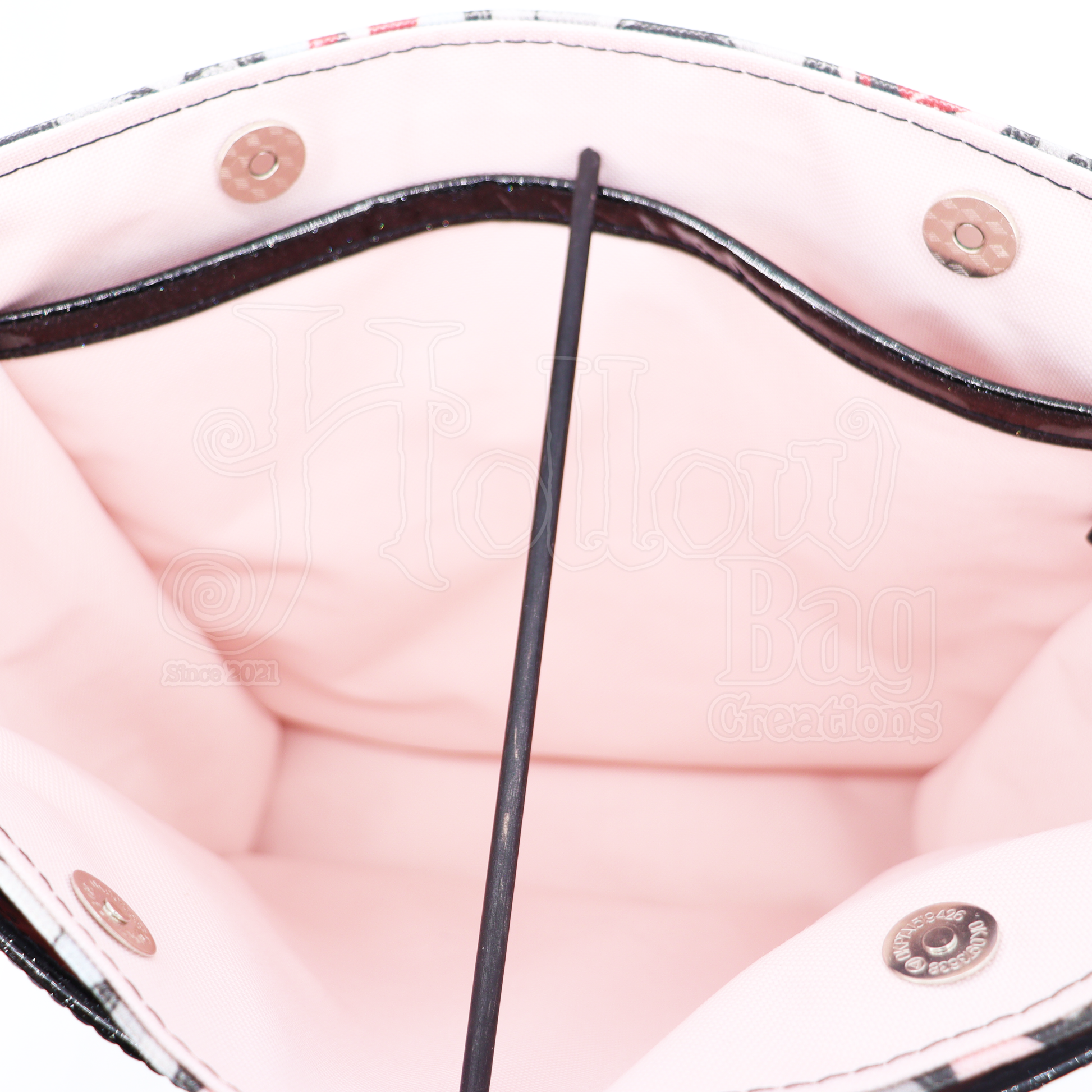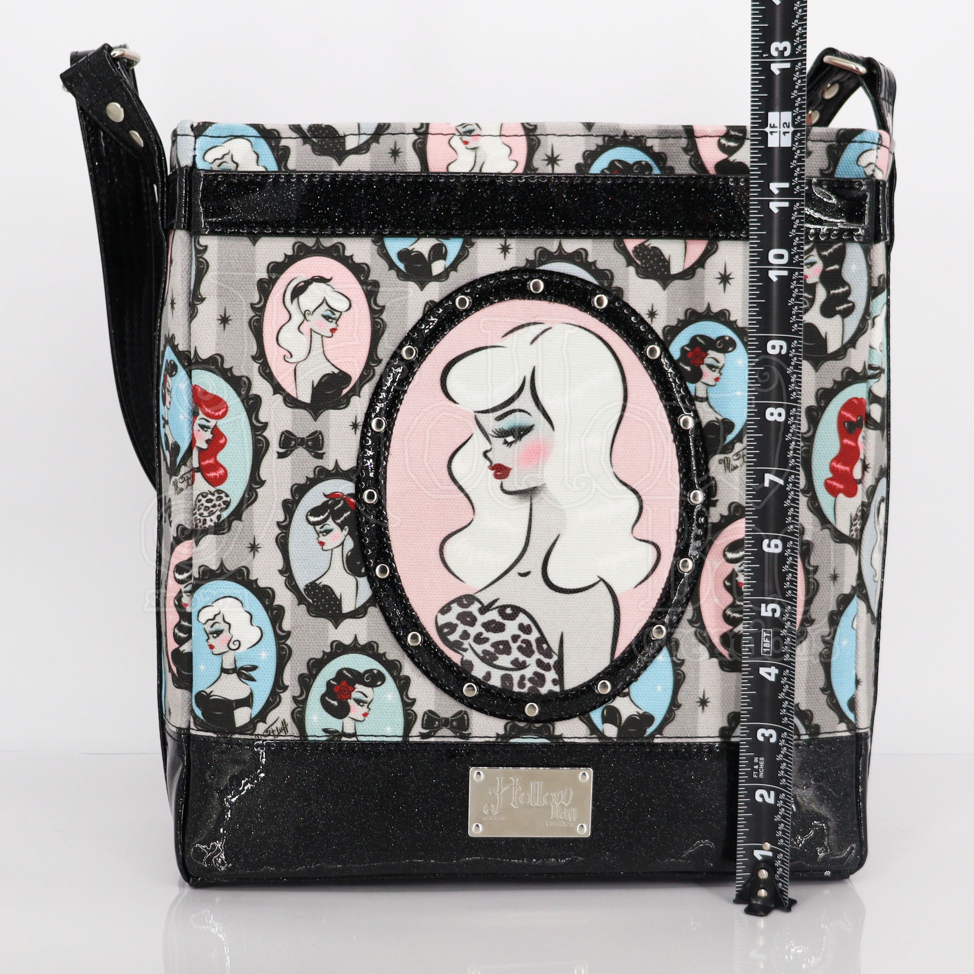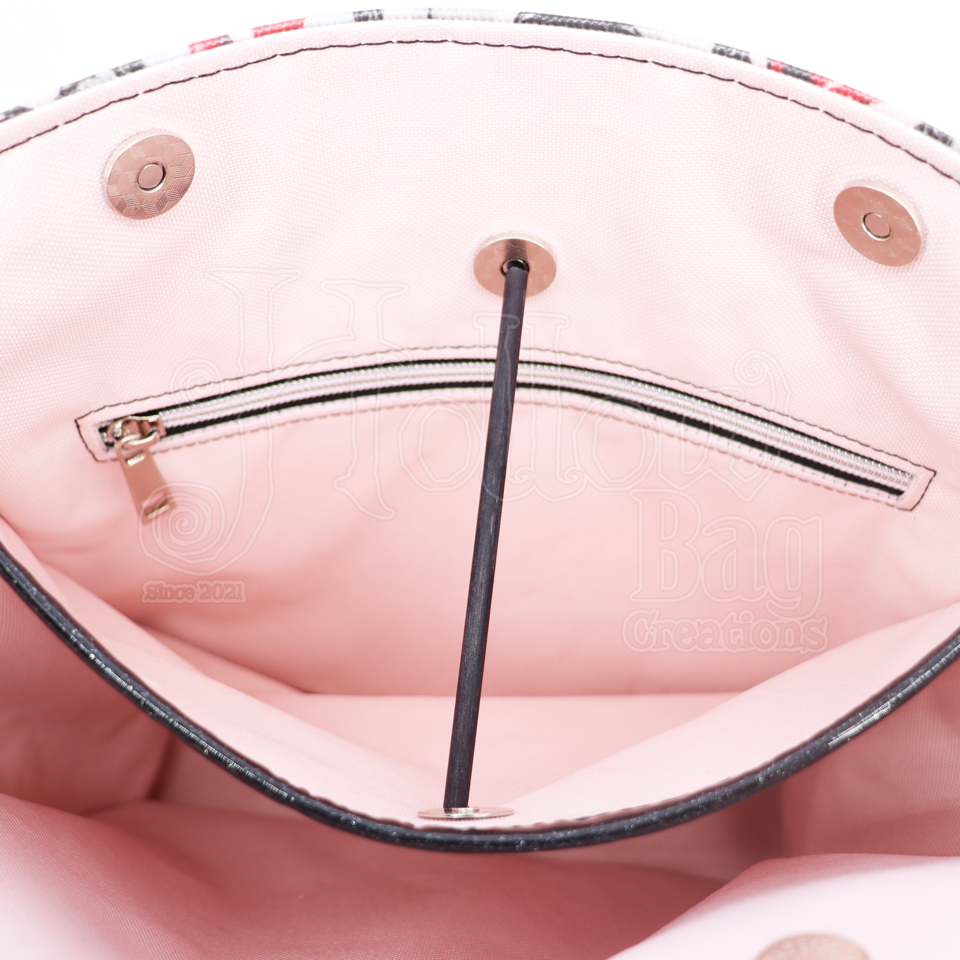 The bag fabrics used are custom glitter vinyl and cotton canvas for the entire outside and handles, with waterproof canvas on the inside. Large ipads & tablets, as well as some laptops, will fit inside!