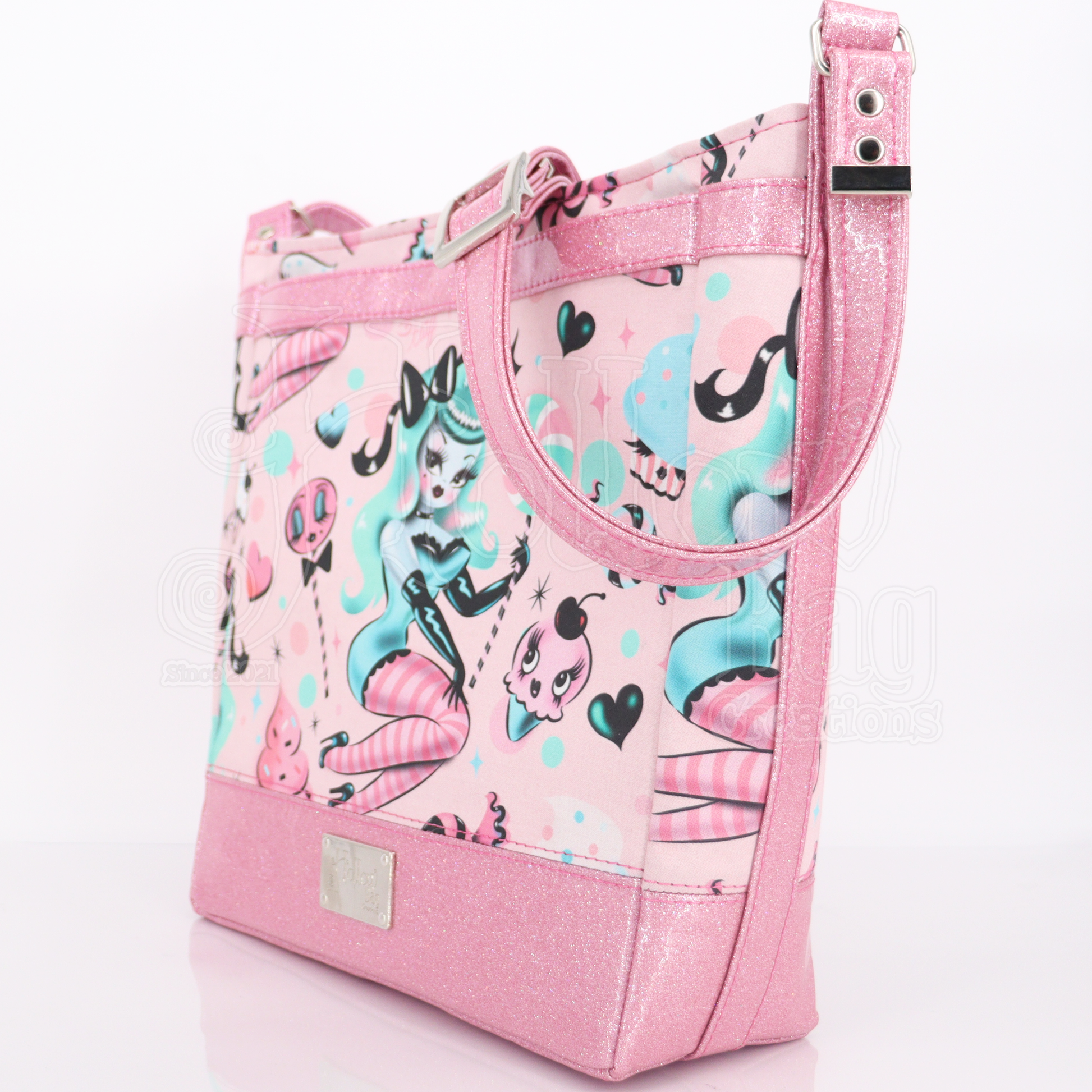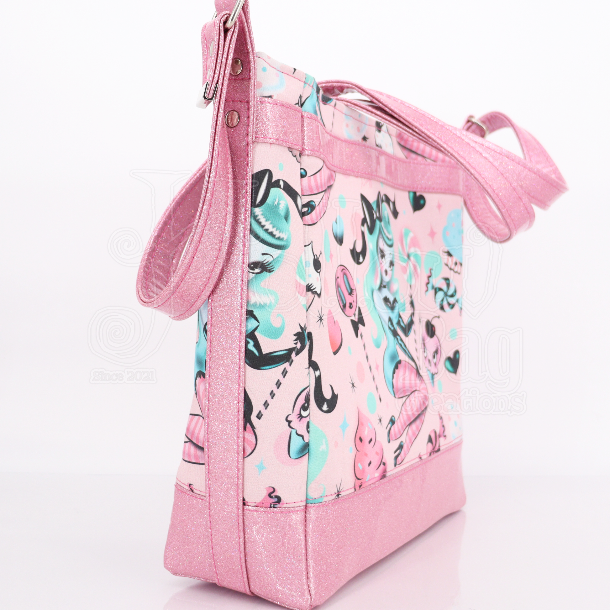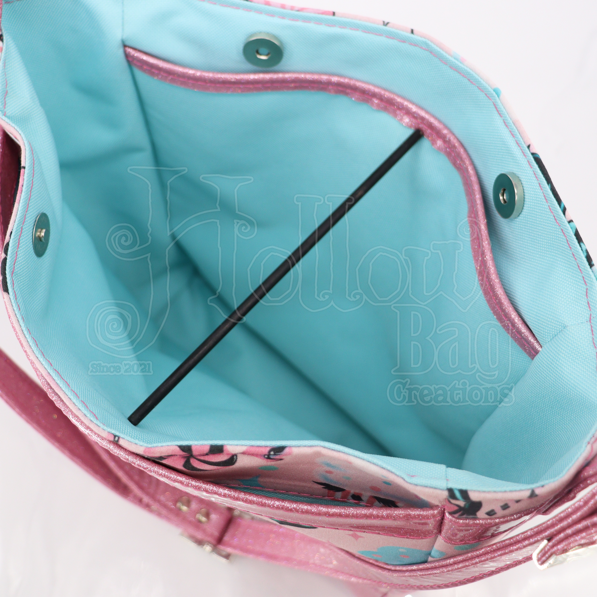 The bag fabrics used are custom glitter vinyl and cotton for the entire outside and handles, with waterproof canvas on the inside. Large ipads & tablets, as well as some laptops, will fit inside!