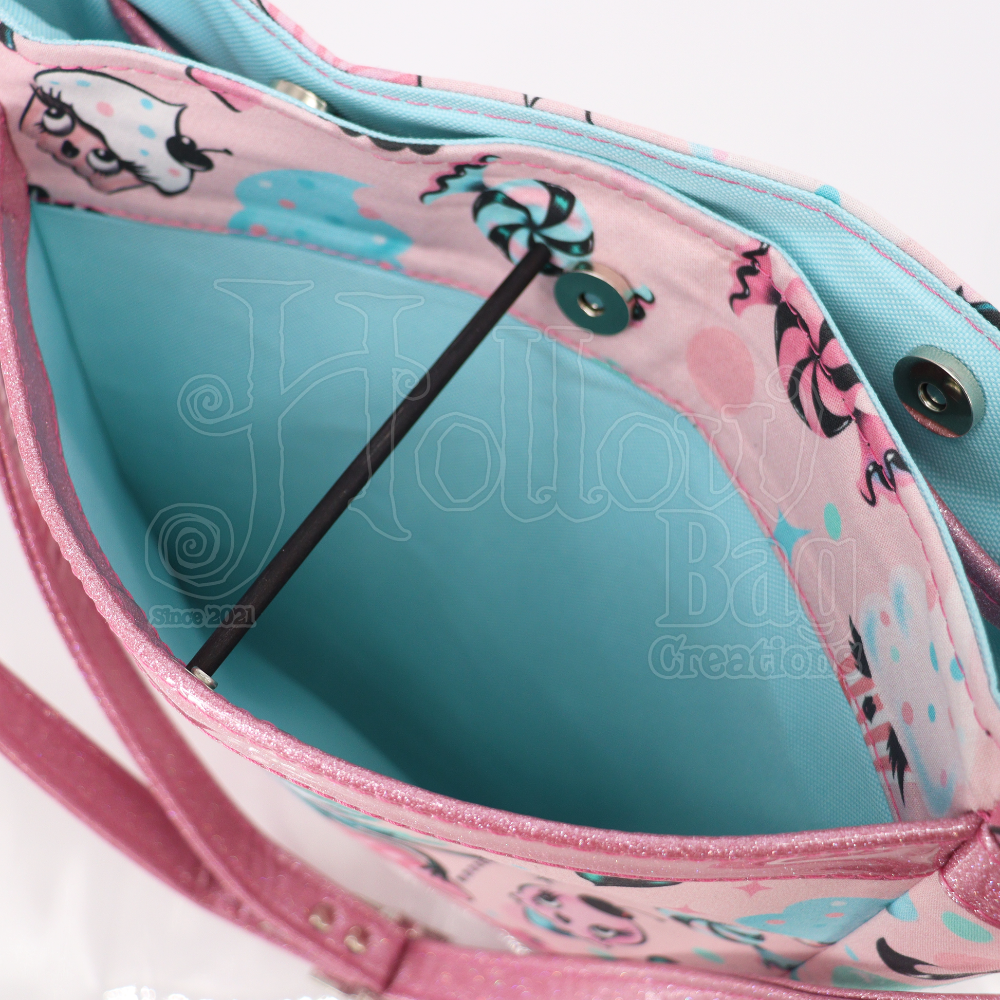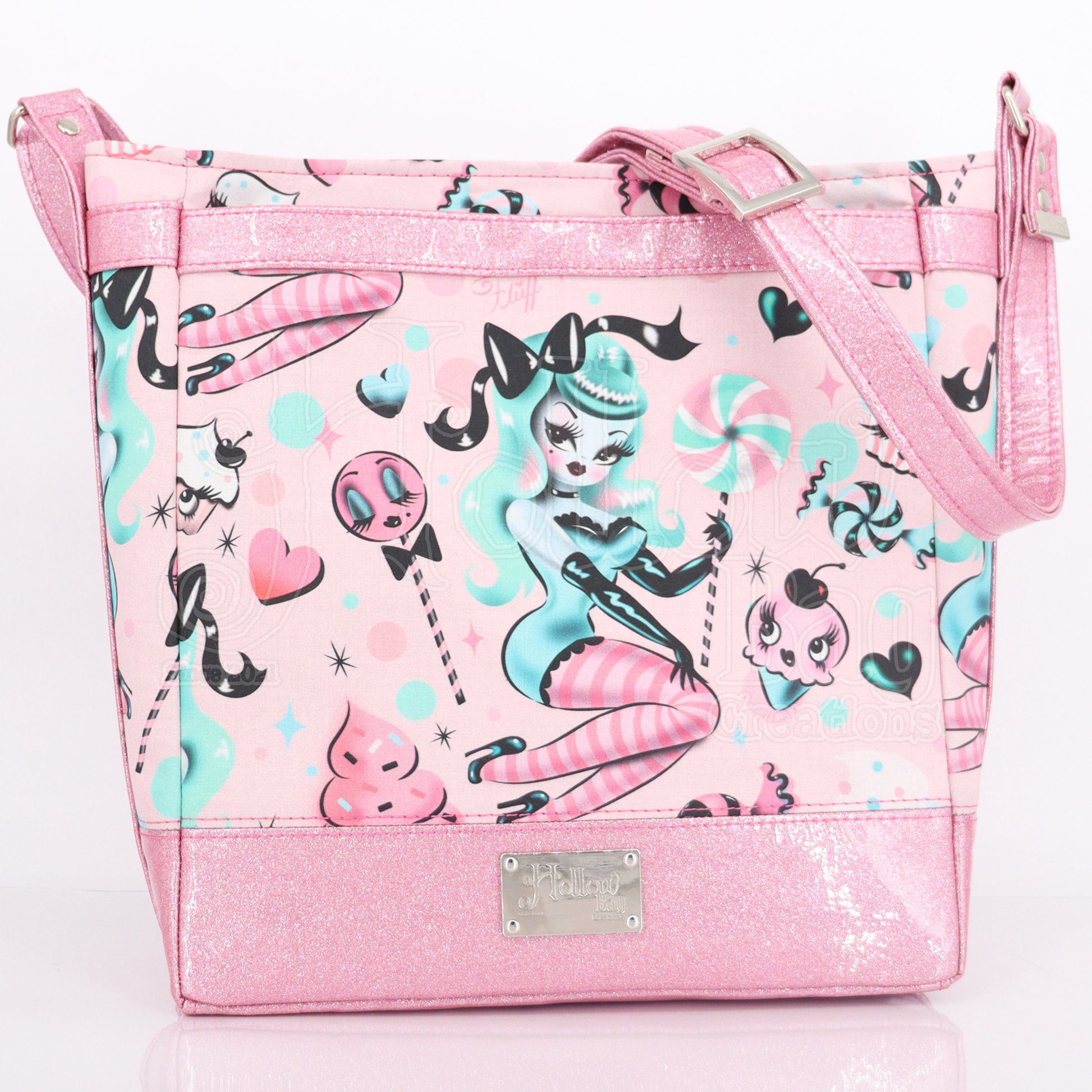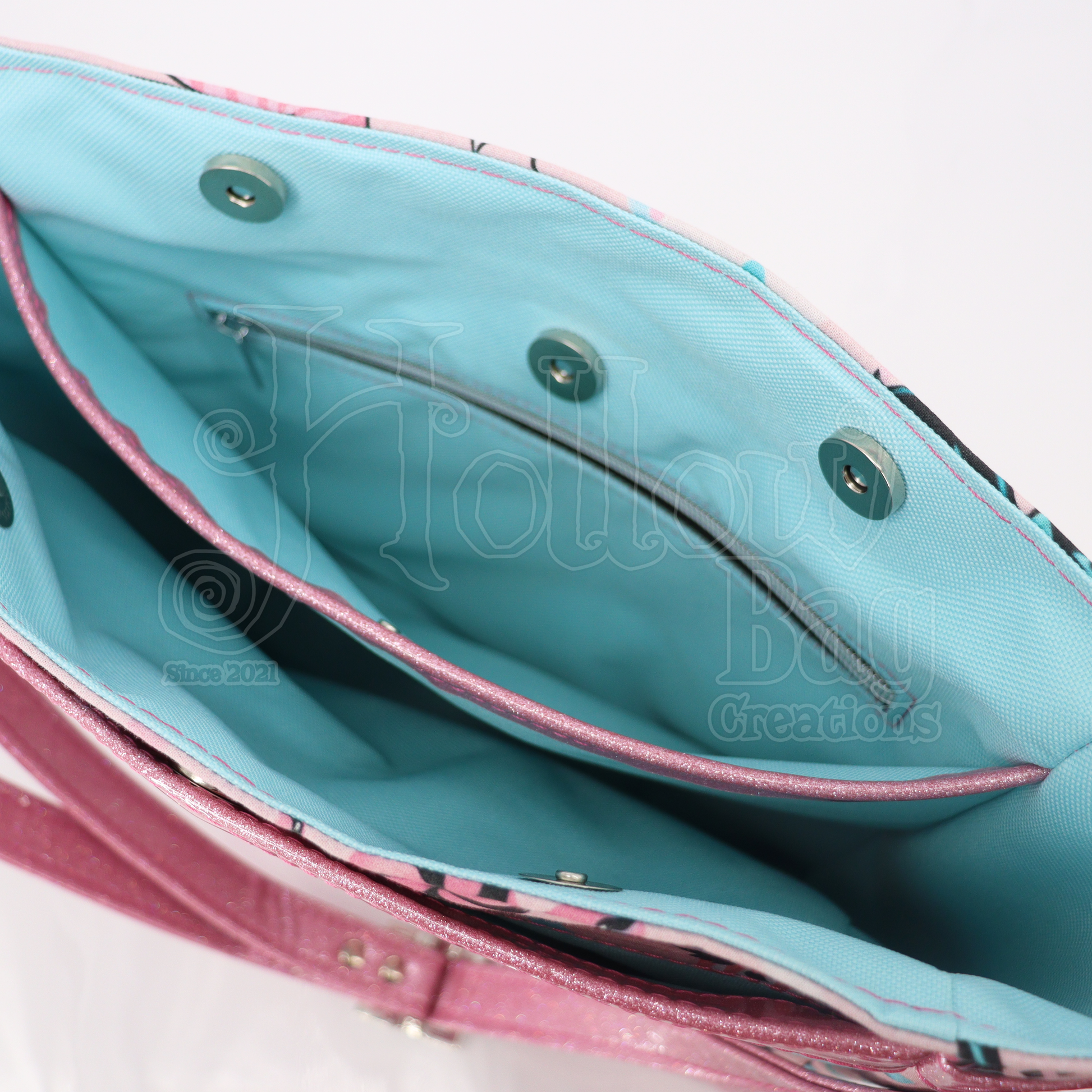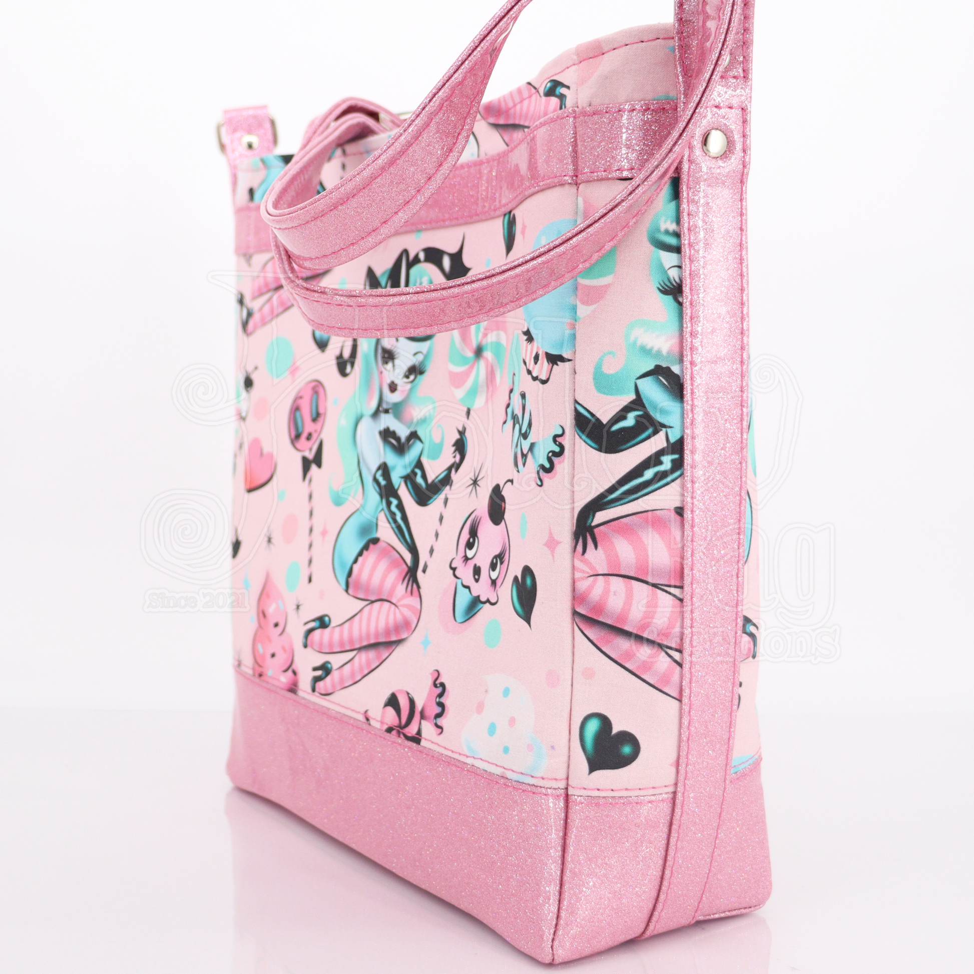 The bag fabrics used are custom glitter vinyl and cotton for the entire outside and handles, with waterproof canvas on the inside. Large ipads & tablets, as well as some laptops, will fit inside!