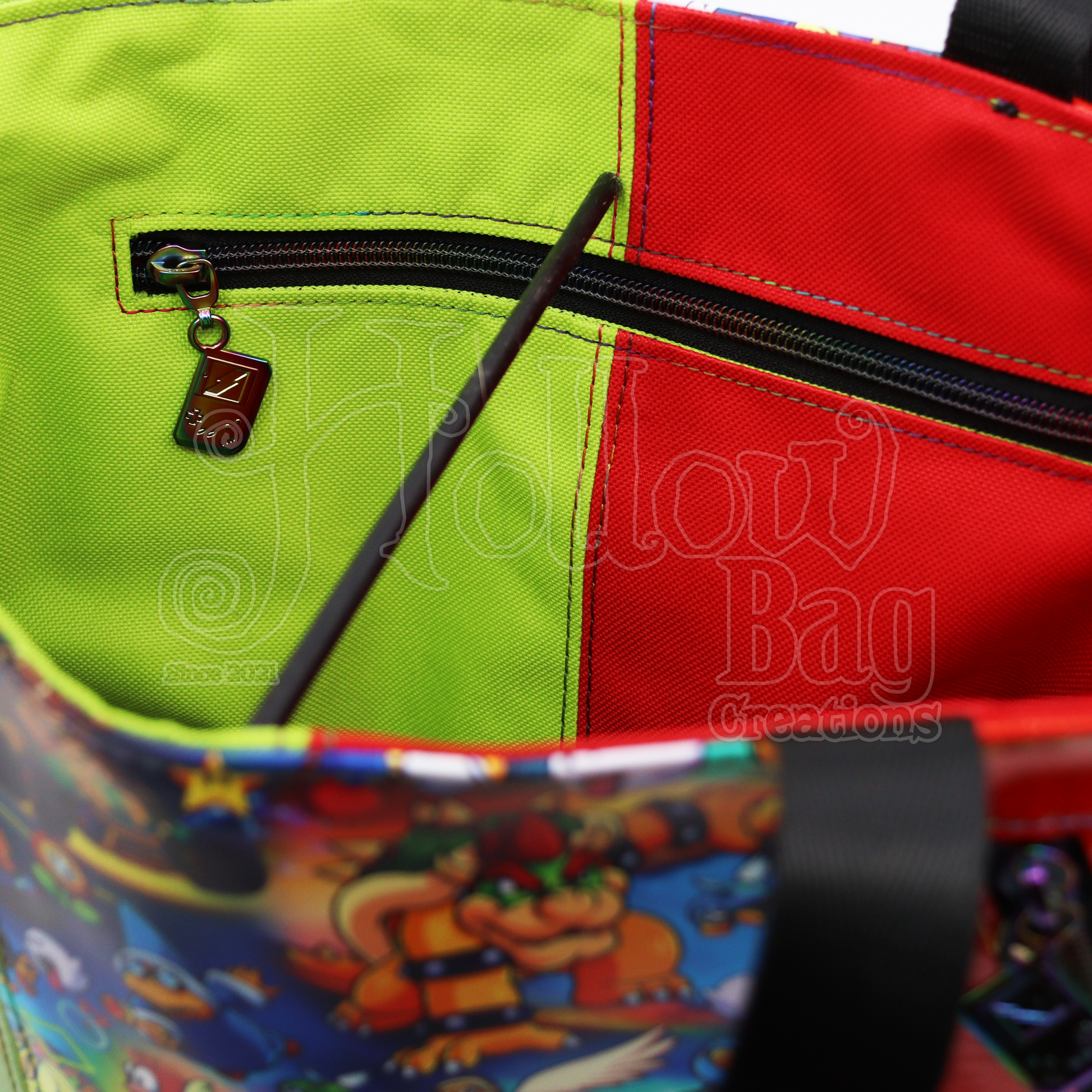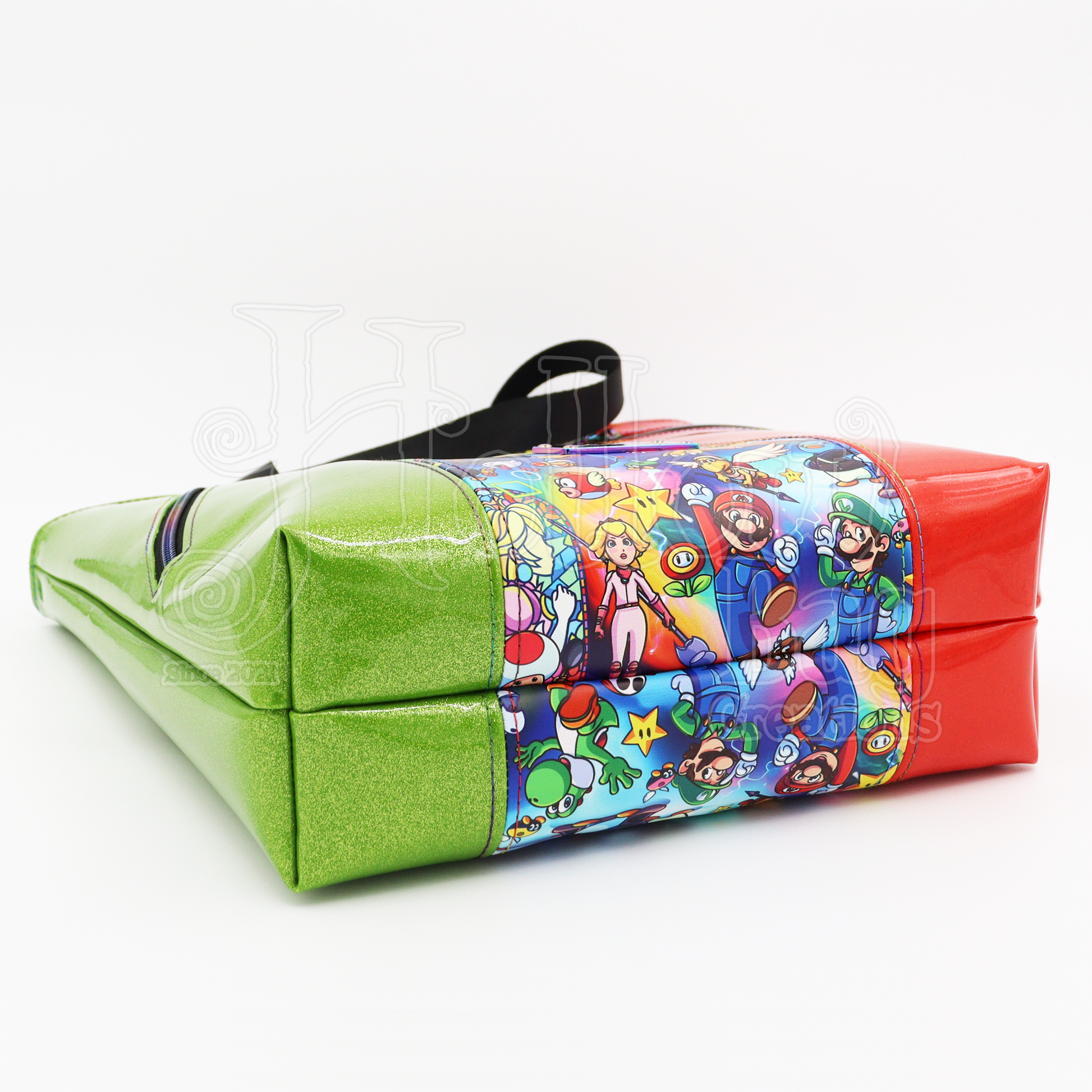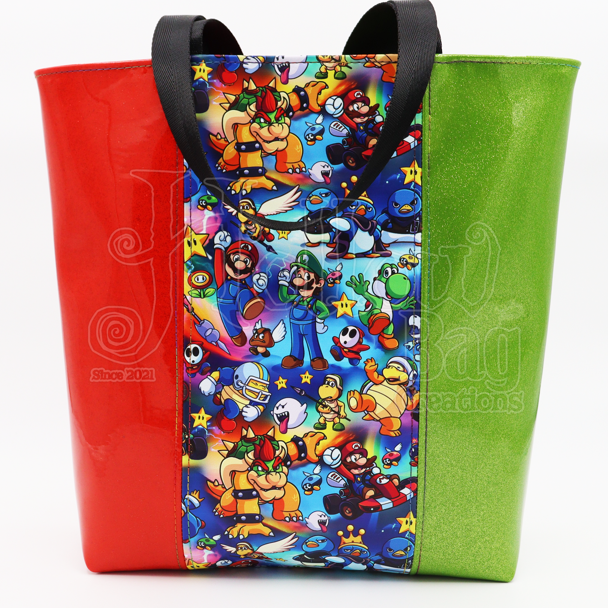 The bag fabrics used are custom vinyl & marine vinyl for the entire outside and handles, and waterproof canvas on the inside
