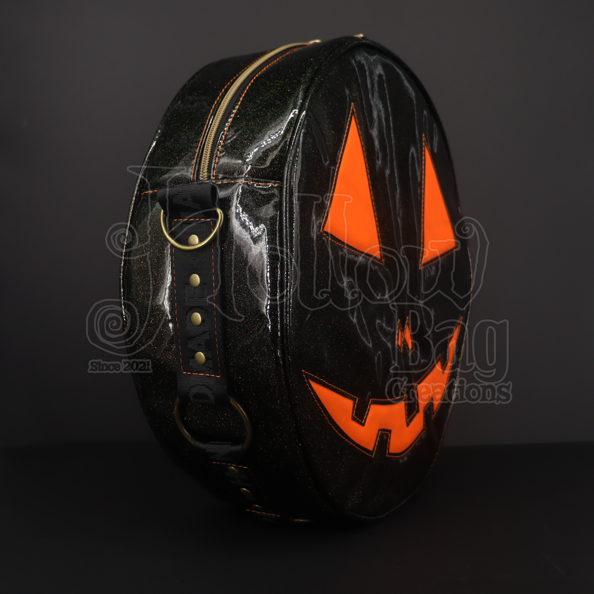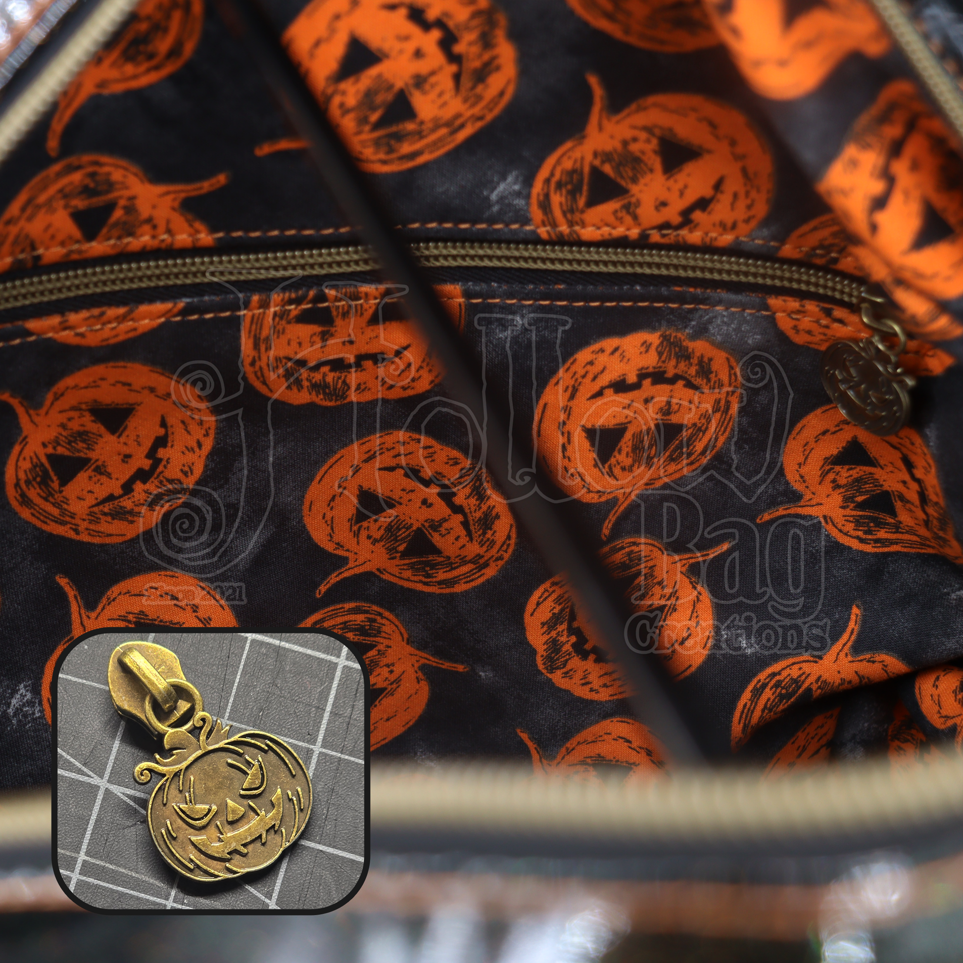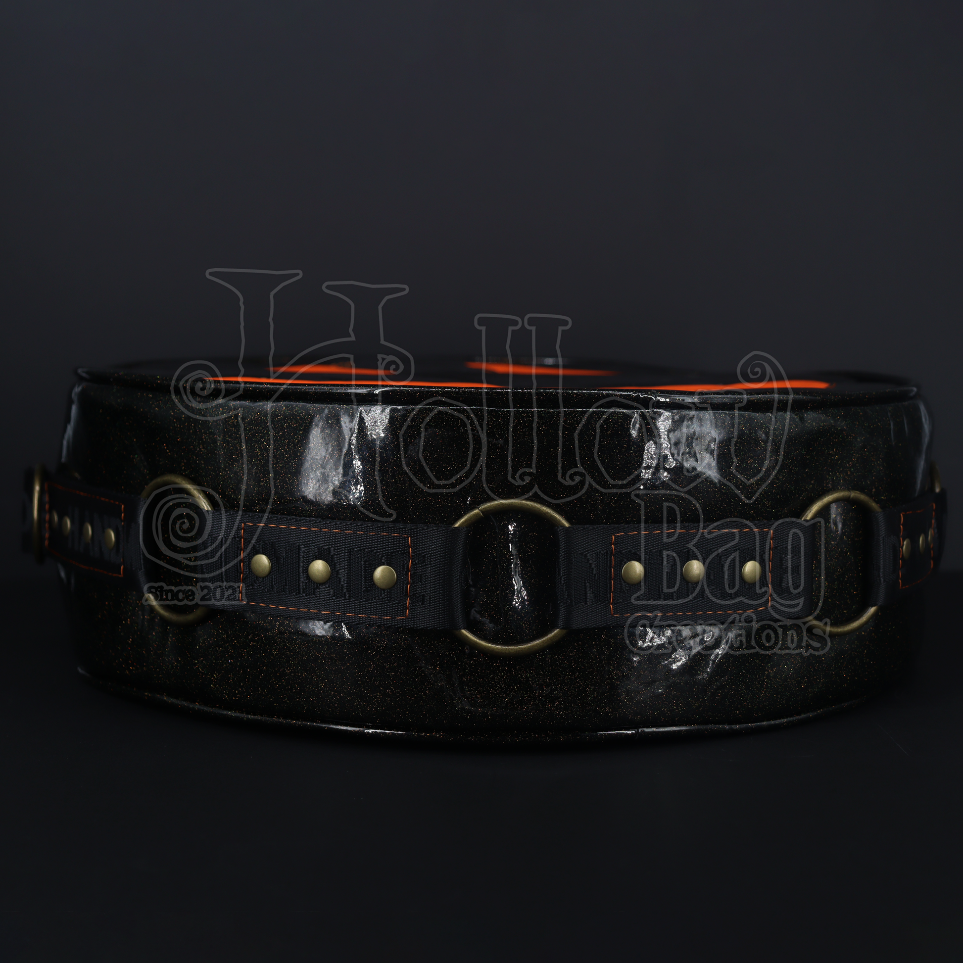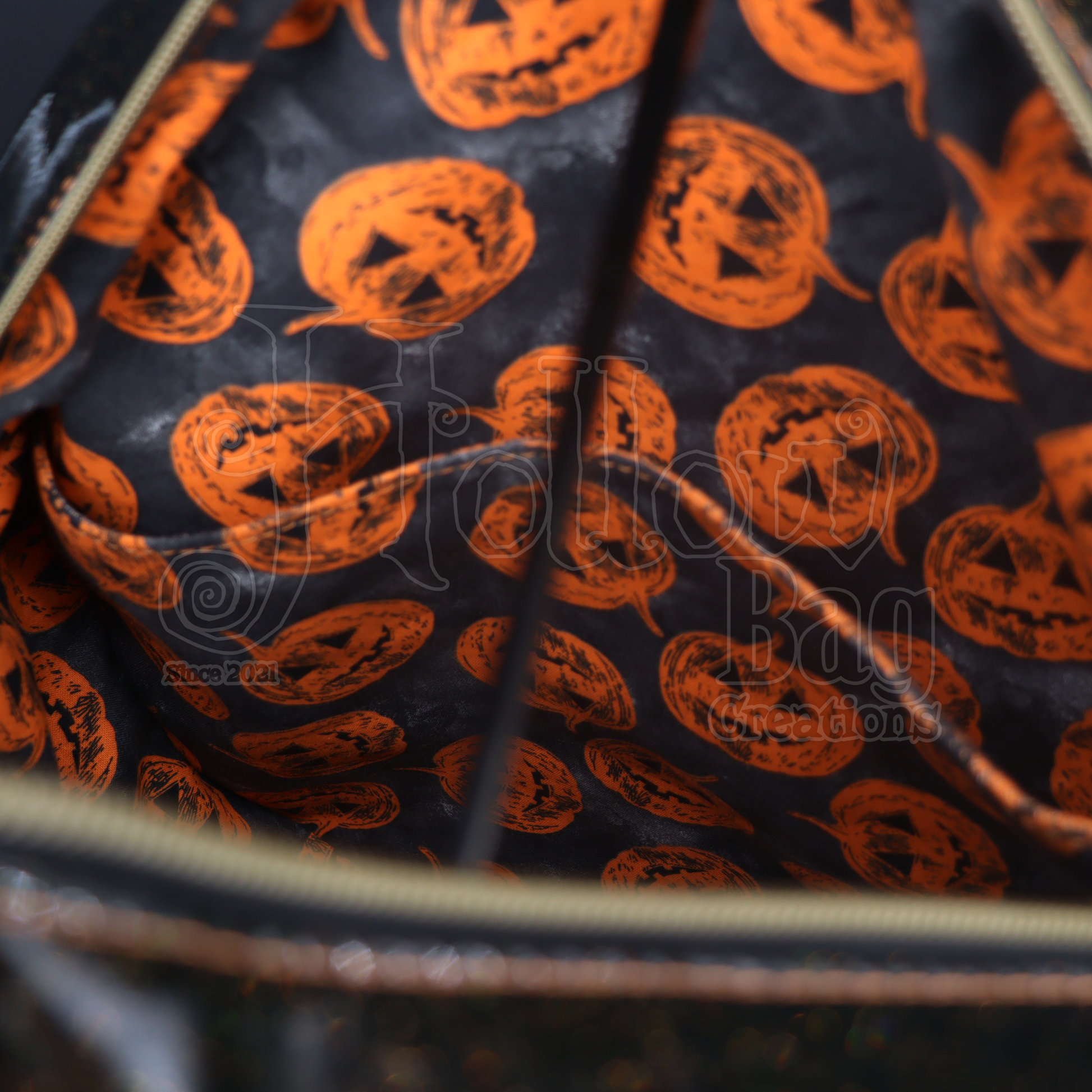 The bag fabrics used are custom vinyl for the entire outside, and custom cotton on the inside. Includes a webbing crossbody strap.