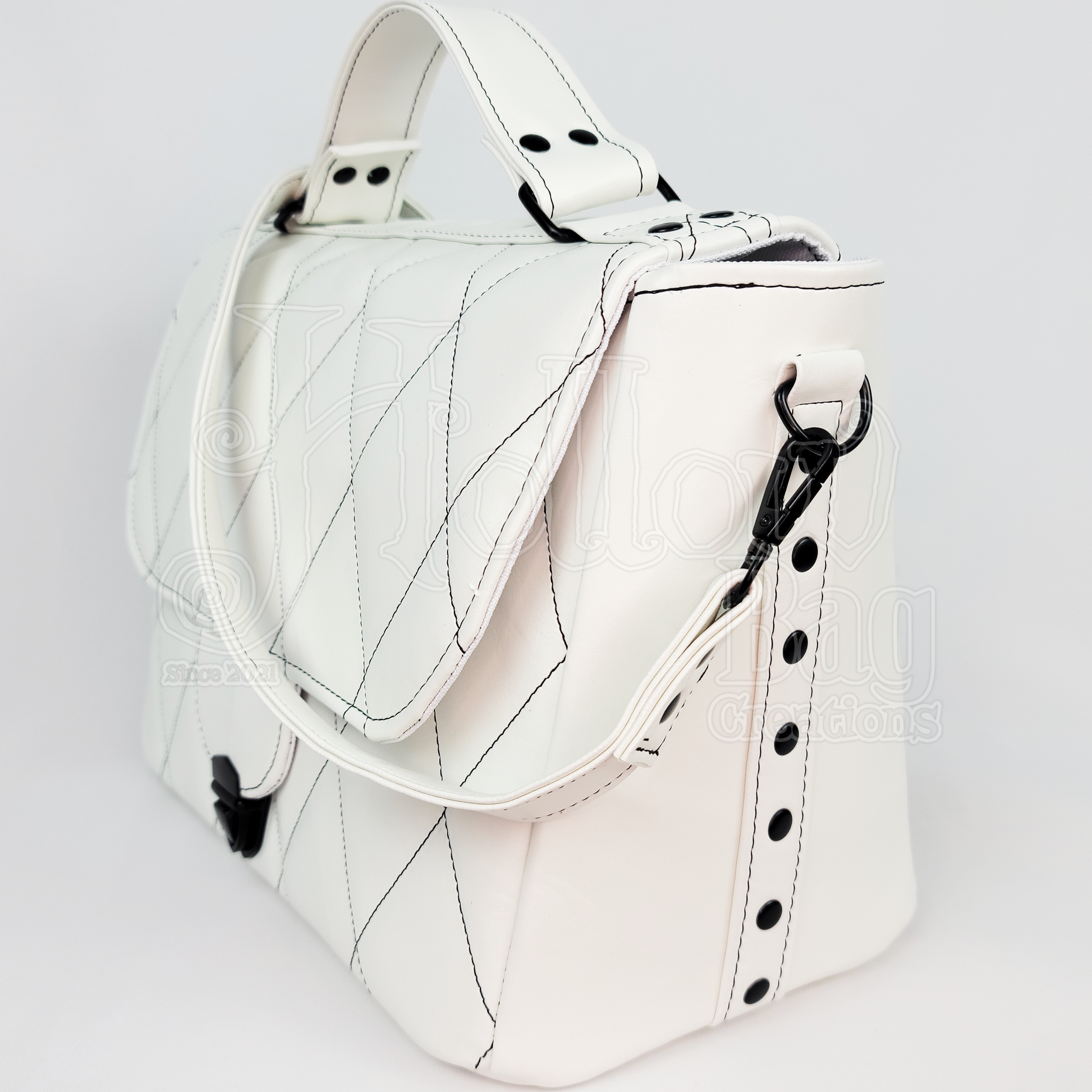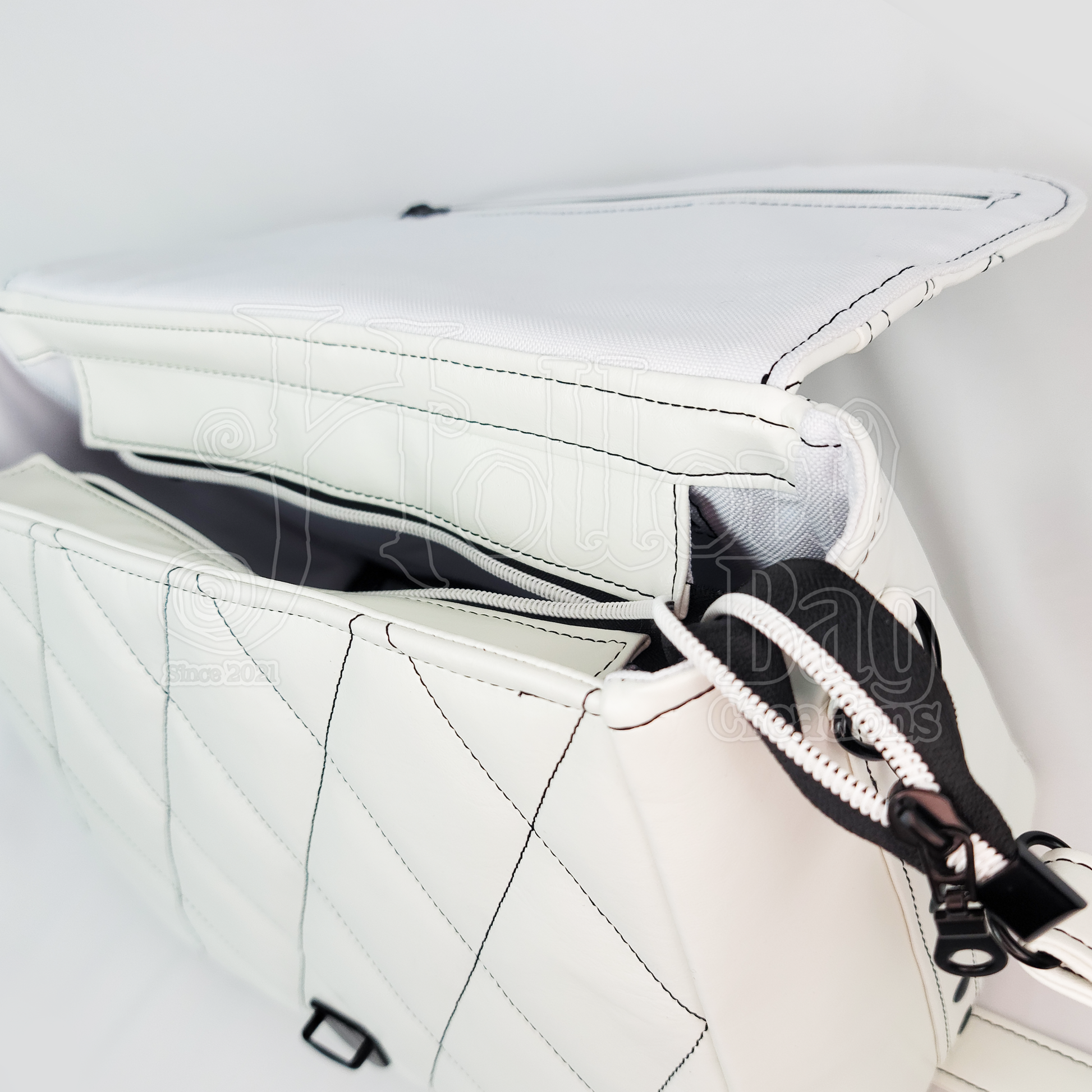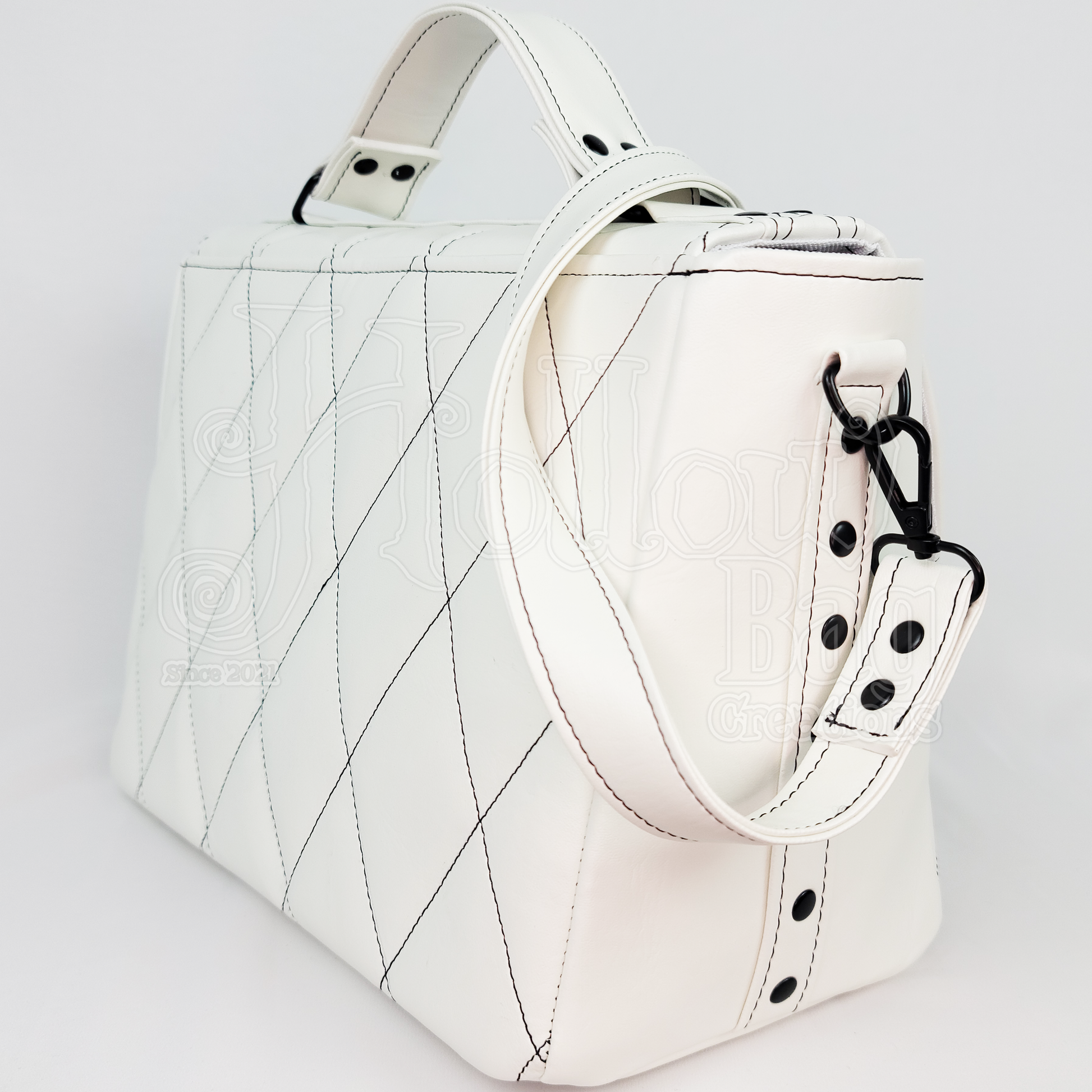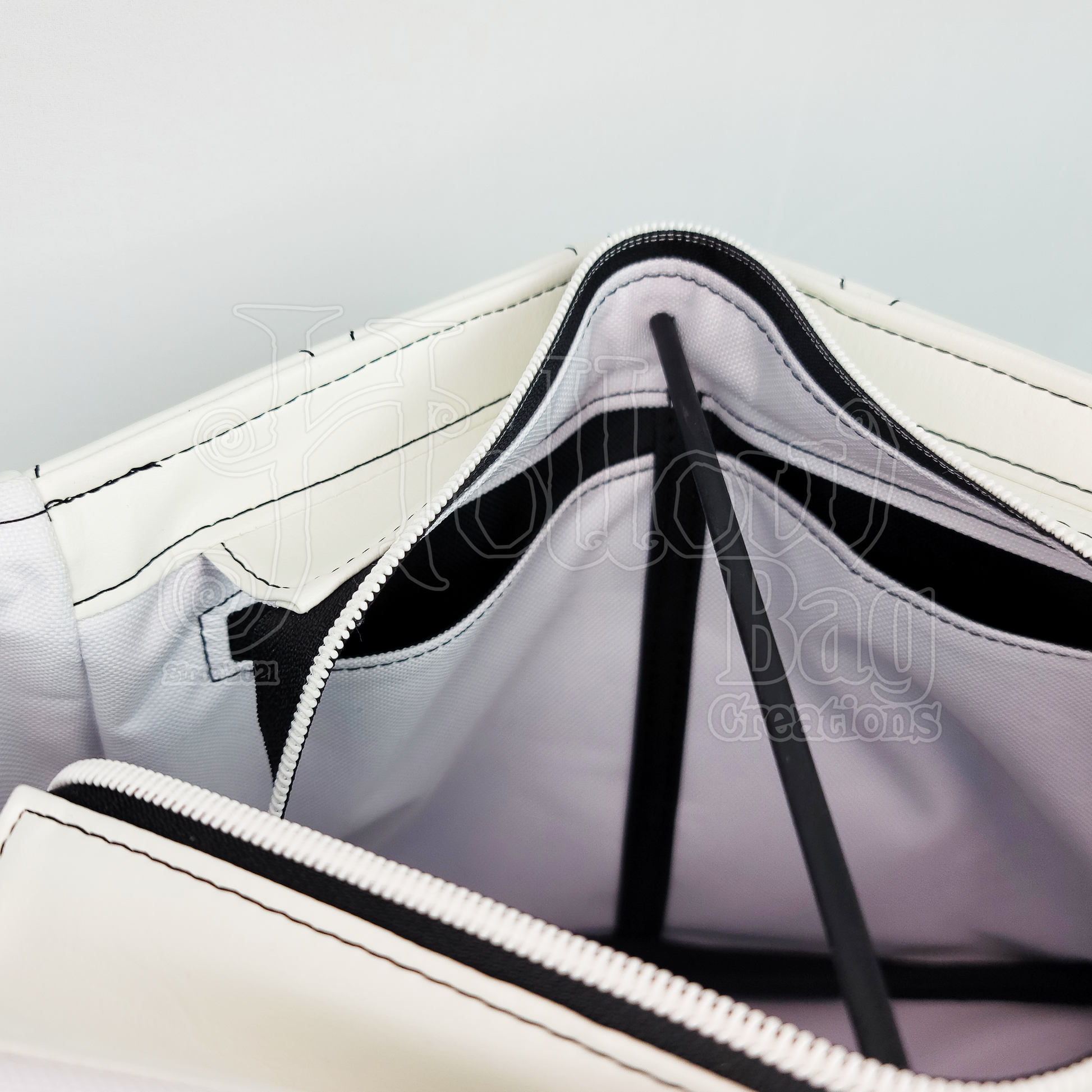 The bag fabrics used are marine vinyl for the entire outside and handles, and waterproof canvas on the inside.