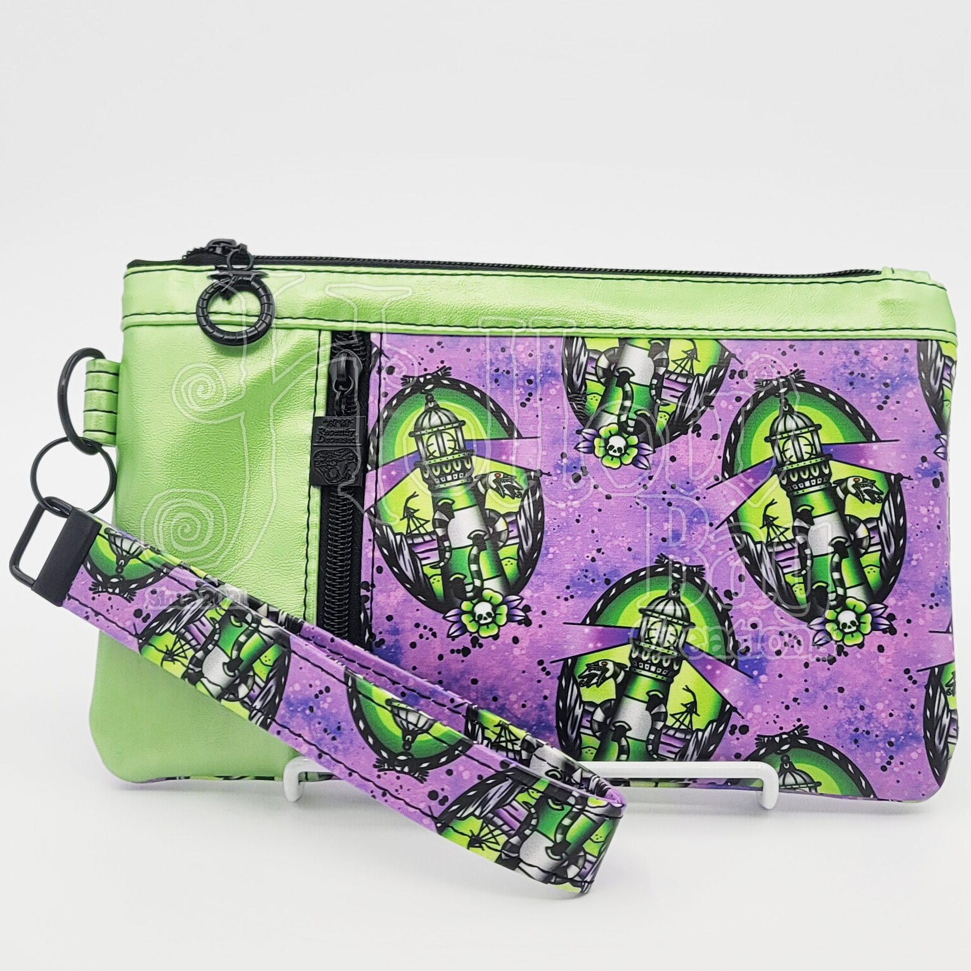This wristlet measures approx 9.5" long x 1/2" wide x 6" tall